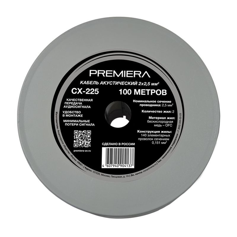 PREMIERA CX-225 - акустический кабель сечением 2 x 2.5 мм² в прозрачной изоляции, на катушке 100 метров.