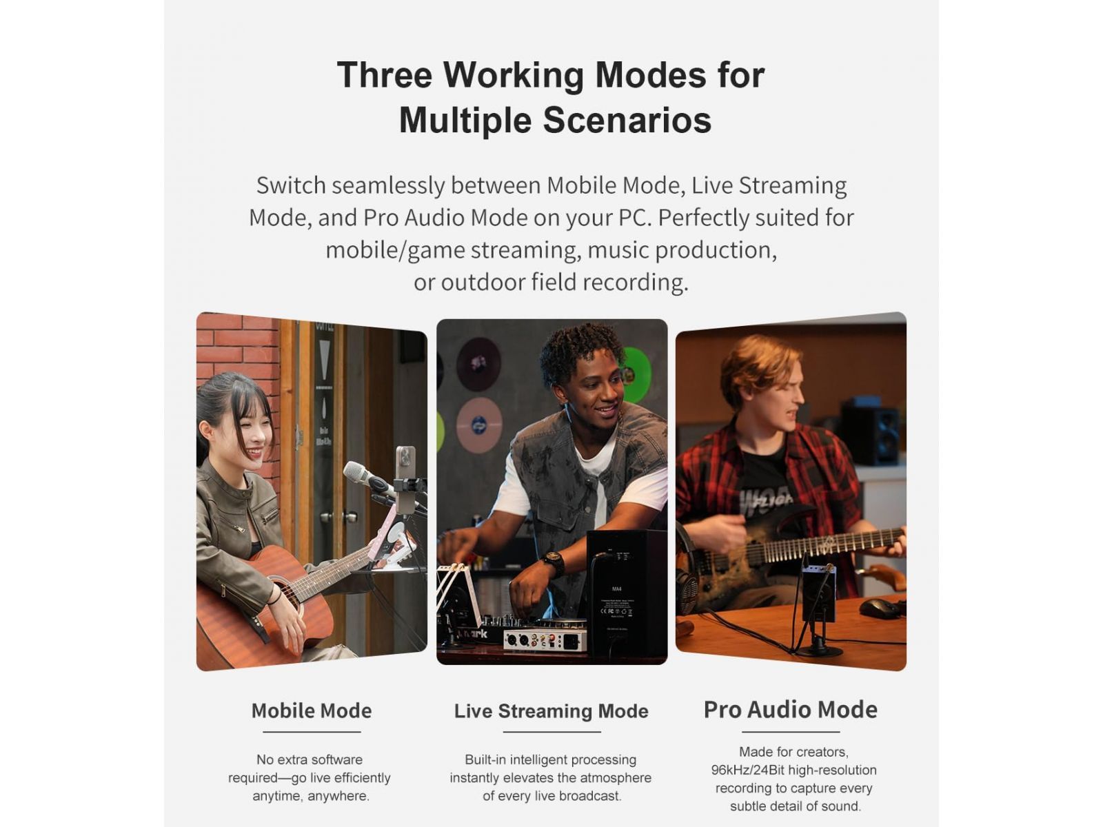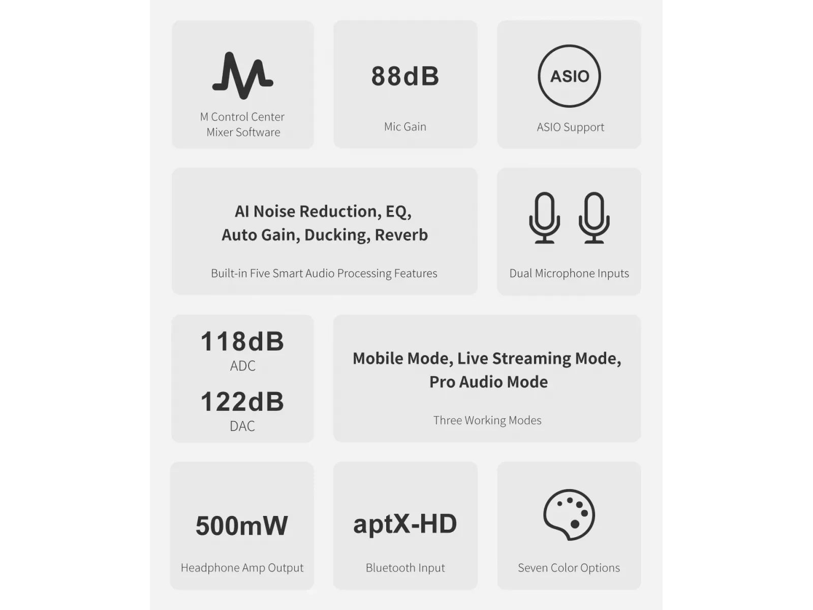 Устройство оснащено трёмя режимами: мобильным для прямого подключения без дополнительного софта, стриминговым с оптимизацией звука в реальном времени и профессиональным режимом с расширенными возможностями обработки. Встроенные функции включают интеллектуальное шумоподавление, автонастройку уровня, ducking, эквалайзер на входе и выходе, а также три режима реверберации (Studio, Live, Hall). Такой набор позволяет минимизировать постобработку и сразу получать чистый, сбалансированный звук.