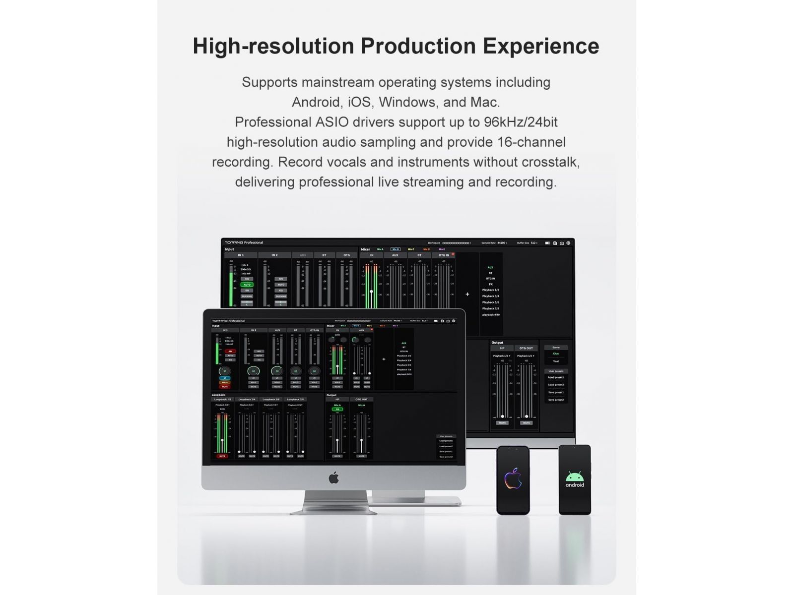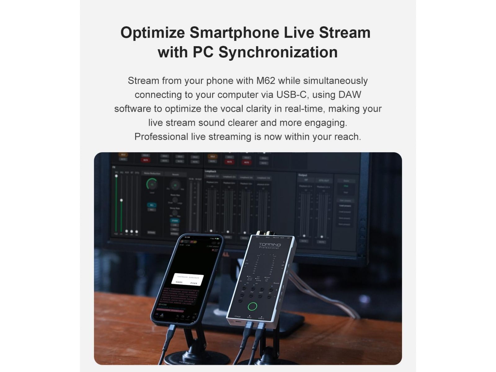 Topping Professional M62 – новый портативный USB-аудиоинтерфейс, разработанный для музыкантов, подкастеров и стримеров, которым важна гибкость подключения и качественная обработка звука в реальном времени. Он поддерживает запись в разрешении до 24 бит / 96 кГц и позволяет работать с 16 дорожками одновременно, что делает устройство подходящим как для вокала и инструментов, так и для живых трансляций.