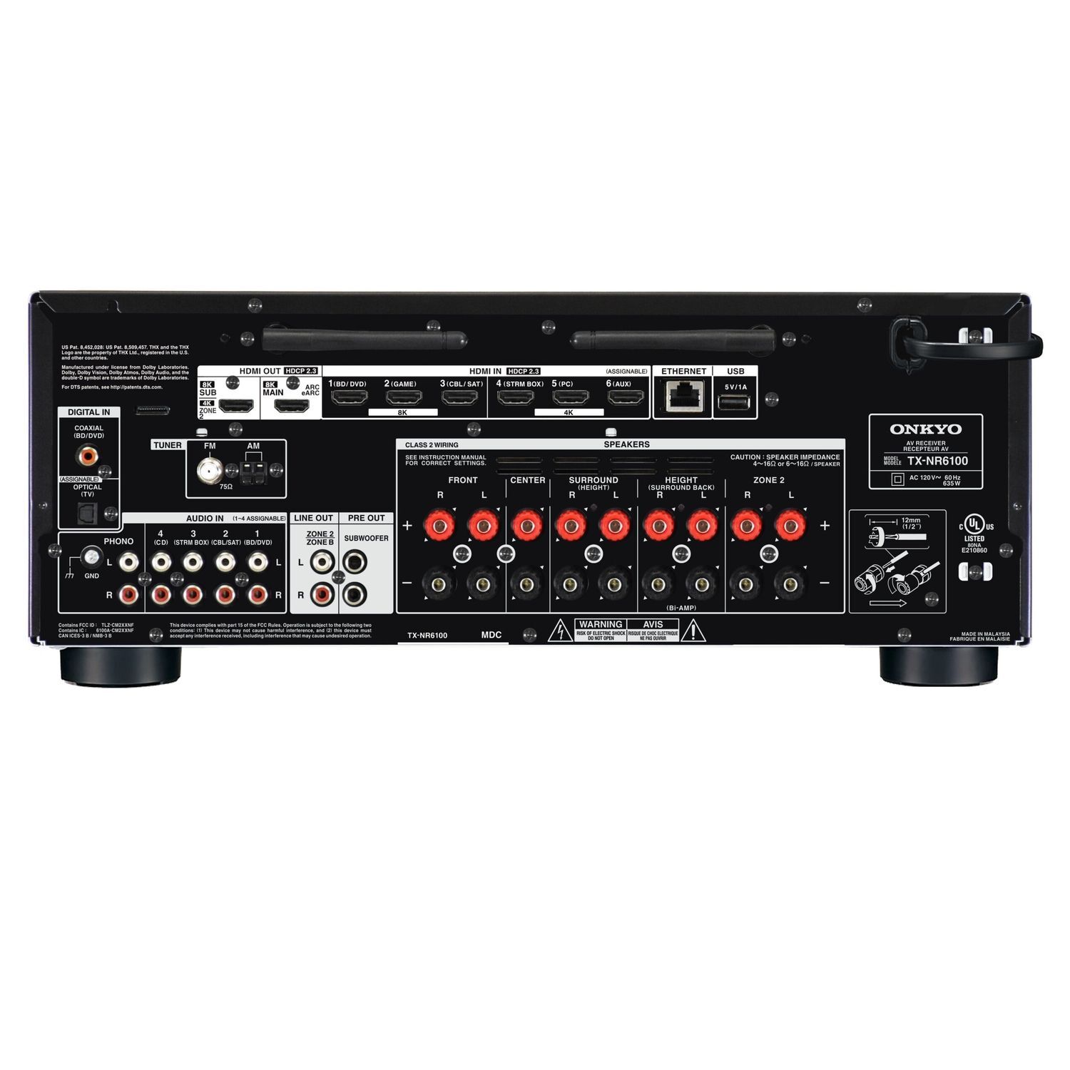 Onkyo TX-NR6100 оснащен декодерами всех основных форматов окружающего звука, в том числе и Dolby Atmos/DTS:X. Поддержка последних возможна в конфигурации 5.2.2, а при желании систему 3D-звука можно реализовать с использованием виртуальных режимов Dolby Height Virtualizer и DTS Virtual:X. В аппарате имеются семь HDMI входов и два выхода с поддержкой передачи видео 8K, Dolby Vision и HDR10, входы HDMI с 1 по 3 и выход Main/Sub поддерживают 8K/60p (4:2:0/10-бит). Среди входов для подключения внешних источников сигнала можно отметить разъёмы встроенного фонокорретора для MM-звукоснимателя проигрывателя винила. AV-ресивер оснащен ЦАП с параметрами 32 бит/384 кГц.