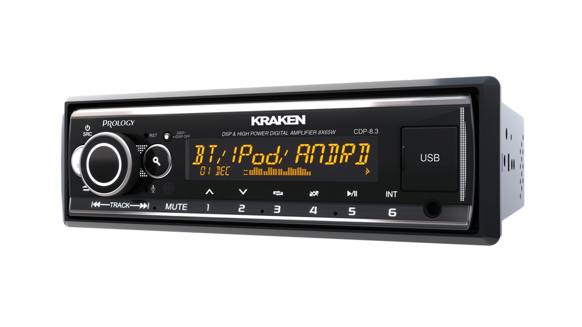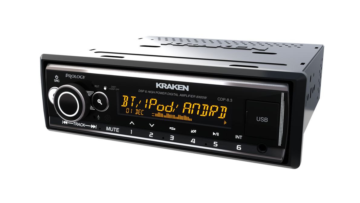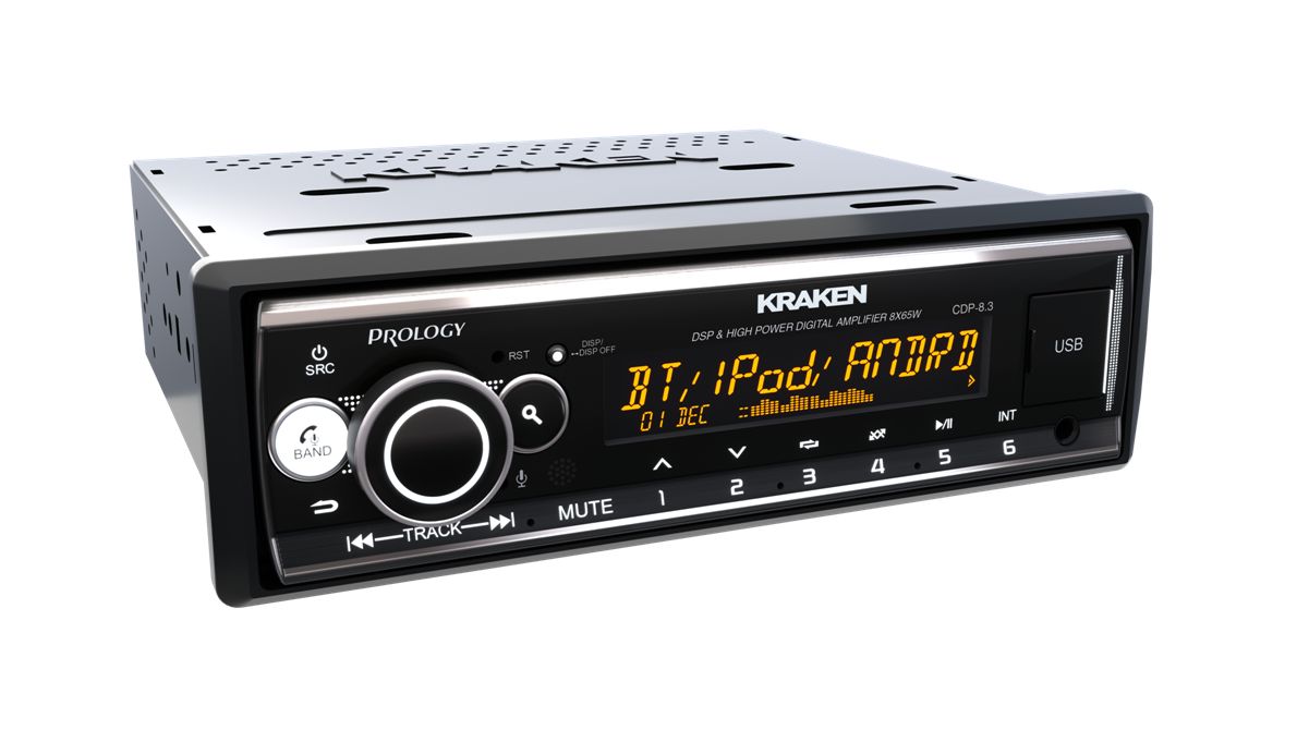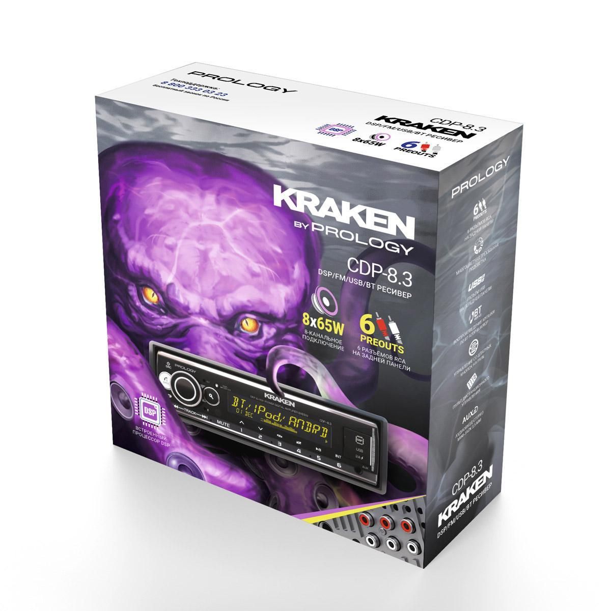 PROLOGY CDP-8.3 KRAKEN — 8 канальная автомагнитола, с цифровыми усилителями D-класса и максимальной мощностью 65 Ватт в каждом из 8-ми каналов. Теперь ещё и + 6 RCA (4 канальный линейный RCA аудиовыход для подключения внешних усилителей, 2 выхода RCA для подключения сабвуфера)!