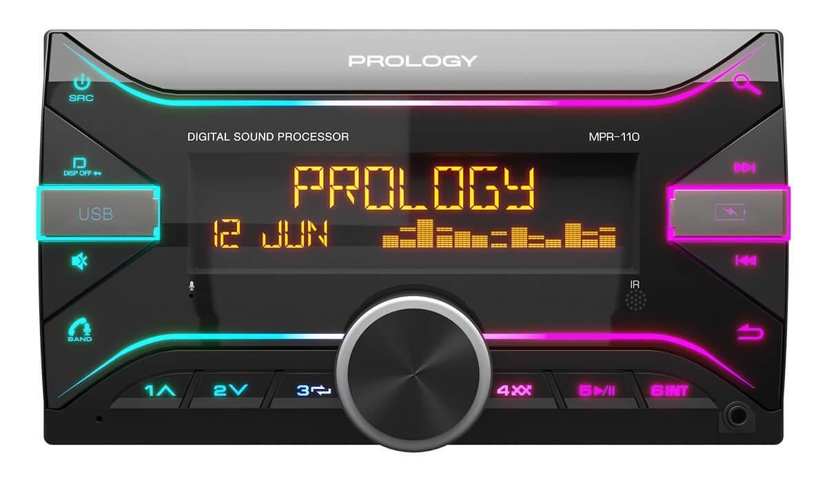 PROLOGY MPR-110 — FM / USB ресивер с Bluetooth и встроенным DSP-процессором стандартного размера 2DIN, который обеспечивает прием радиостанций в диапазонах FM / УКВ / AM и воспроизведение медиафайлов форматов MP3, WAV, и FLAC, записанных на USB-накопители. Устройство позволяет передавать звук с внешних источников через линейный аудиовход и беспроводной интерфейс Bluetooth. Поддерживается управление мобильным телефоном через интерфейс Bluetooth (ver. 5.3). Магнитолой можно управлять при помощи мобильного приложения Prology Audio, установленного на смартфон с операционной системой Android или iOS.