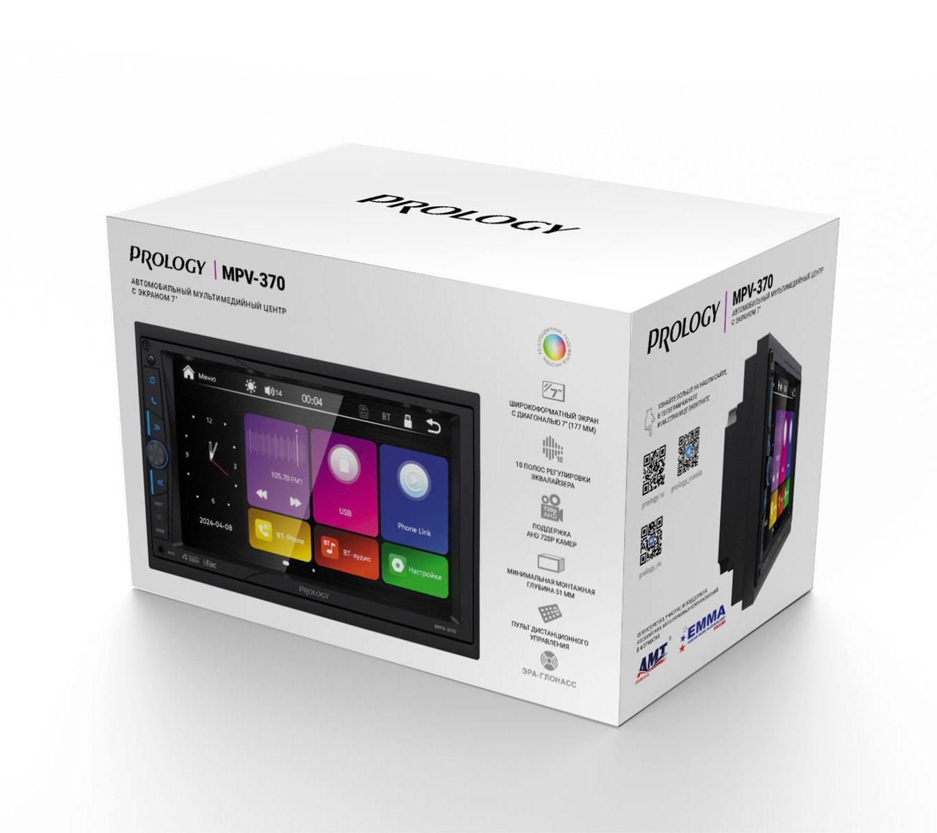 Автомобильный мультимедийный центр PROLOGY MPV-370 монтажного размера 2DIN обеспечивает прием радиостанций в диапазонах FM / УКВ, воспроизведение медиафайлов, записанных на карты памяти USB / microSD, передачу сигнала с внешних источников, а также управление мобильным телефоном через интерфейс Bluetooth (version 4.2). Поддерживается подключение штатных кнопок управления аудиосистемой на руле (интерфейс SWC).