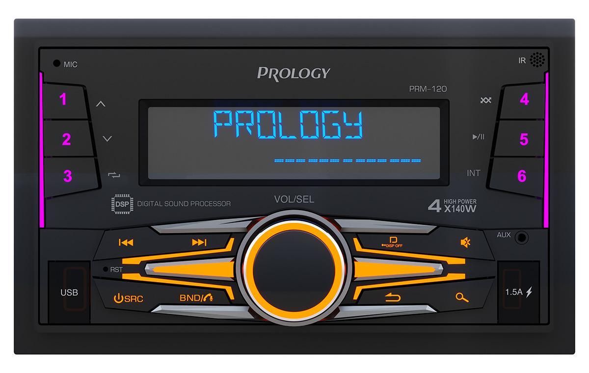 PROLOGY PRM-120 POSEIDON — FM / USB-ресивер с Bluetooth и встроенным аудиопроцессором DSP стандартного размера 2DIN, который обеспечивает прием радиостанций в диапазоне FM / УКВ и воспроизведение медиафайлов MP3, WAV, и FLAC форматов, записанных на USB накопители, передачу звука с внешних источников через линейный аудиовход и беспроводной интерфейс Bluetooth. Поддерживается управление мобильным телефоном через интерфейс Bluetooth® (ver. 4.2). Головное устройство нового поколения, с которым можно сэкономить на отдельных усилителях мощности. Содержит встроенный усилитель D-класса с повышающим блоком питания, способный выдавать до 140 Вт на канал. Максимальная гибкость в выборе конфигураций аудиосистемы вплоть до вариантов с подключением сабвуферов непосредственно к головному устройству. Устройством можно управлять при помощи мобильного приложения Prology Audio*, установленного на смартфон с операционной системой Android или iOS.