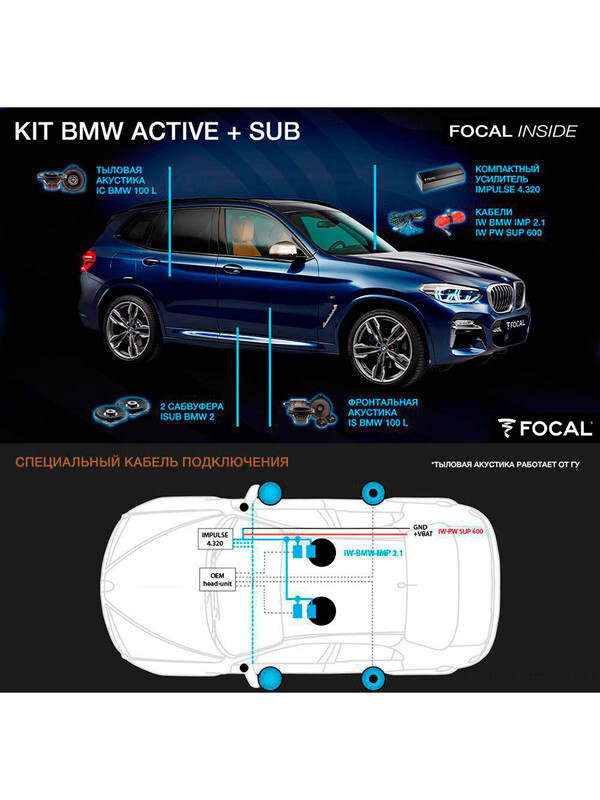 Данный комплект предназначен для водителей, которые хотят заменить свою оригинальную аудиосистему качественным звуковым решением. KIT BMW ACTIVE + SUB совместим с большинством предустановленных вариантов оригинальной аудиосистемы BMW, за исключением систем с сабвуфером Harman Hi-Fi. А также KIT BMW ACTIVE + SUB - несовместим с автомобилями, в которых установлены штатные усилители премиум-класса Hi-Fi. Фронтальную компонентную акустику IS BMW 100L можно установить если есть места для высокочастотных динамиков. Если в вашем автомобиле нет места для твитера, обратитесь в отдел запасных частей BMW, для заказа соответствующих аксессуаров.