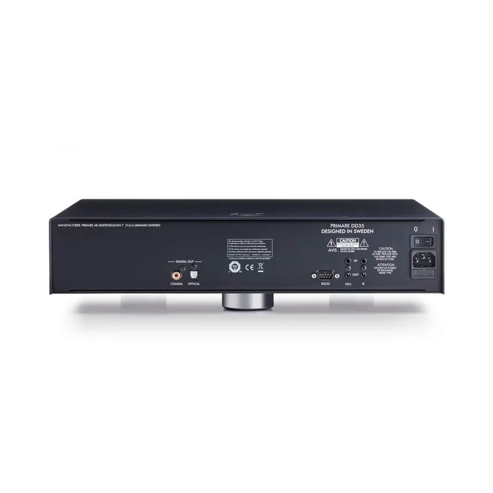 Топовый CD транспорт Primare DD35 сами разработчики называют лучшим в истории компании. Проигрыватель оснащен CD-приводом TEAC CD 5020A-AT. Проигрыватель оборудован цифровыми выходами коаксиального и оптического типа. На задней панели плейера располагаются все необходимые вспомогательные разъемы: входы/выходы триггера 12 В и внешнего ИК-датчика, а также RS-232.
