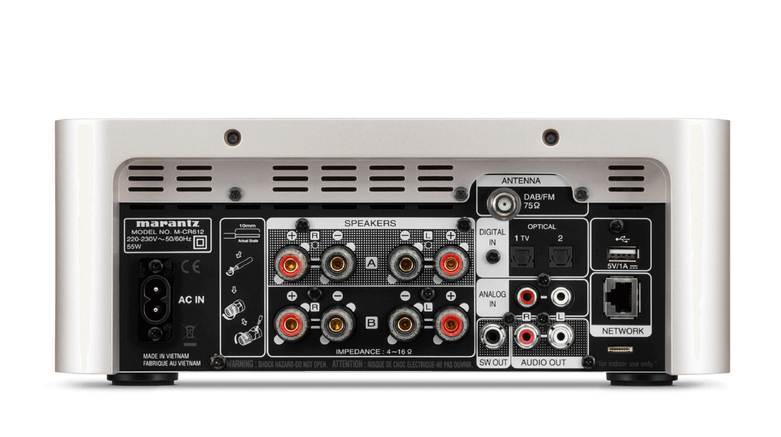 Также Marantz M-CR612 Melody X оснащен двумя аналоговыми и двумя цифровыми входами для внешних источников. Имеется в устройстве и USB-вход для портативных носителей, при этом поддерживается воспроизведение как Lossless, так и файлов High Resolution.