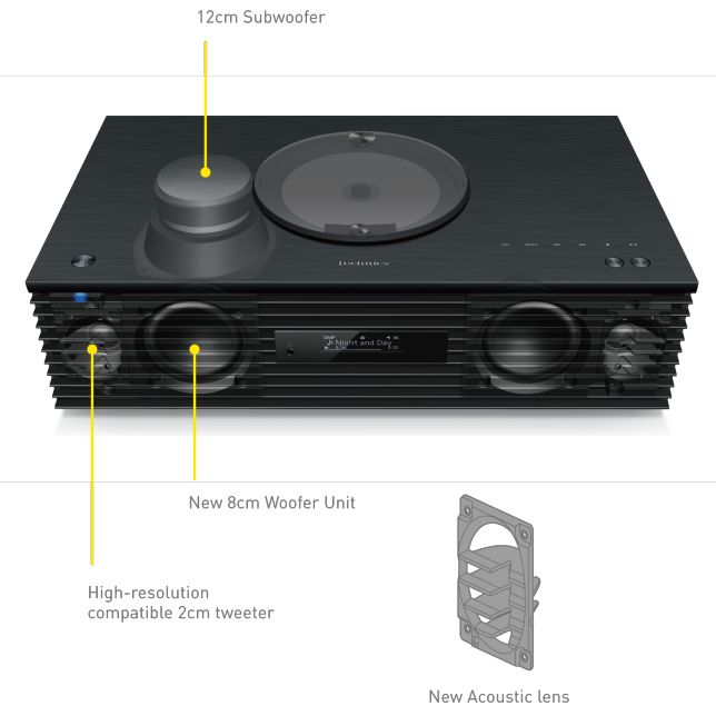 Беспроводная аудиосистема Technics SC-C70MK2 представляет собой модель «все-в-одном» и отлично подходит для качественного озвучивания небольших комнат. Колонка выполнена в очень привлекательном минималистичном дизайне и отличается превосходной внешней отделкой, и оснащена удобным OLED-дисплеем. В колонке Technics SC-C70MK2 установлено пять специально разработанных для нее динамиков, суммарная работа которых делает звучание сбалансированным и музыкальным. Два купольных твитера оснащены шелковыми диафрагмами и дополнены специальными акустическими линзами, выравнивающими их диаграмму направленности. Также в Technics SC-C70MK2 установлены два СЧ/НЧ динамика и отдельный динамик для воспроизведения самых низких басов. Передняя решетка колонки, выполненная по принципу жалюзи, не только защищает динамики от повреждений, но и служит для правильного распространения звуковых волн. Секция усилителя в модели Technics SC-C70MK2 выполнена по запатентованной технологии JENO Engine, которая позволила свести к минимуму любые искажения. Кроме того, здесь появилась новая технология Space Tune для коррекции частотных характеристик в зависимости от типа размещения системы. Предусмотрено три предустановки параметров данной настройки, однако звучание можно настроить и с помощью микрофона через специальное приложение (для iOS-устройств). Колонка оснащена исчерпывающим набором встроенных источников сигнала. В модели Technics SC-C70MK2 имеются CD-плеер с верхней загрузкой диска, FM-тюнер, вход USB для флешек с музыкальными файлами, а также оптический и аналоговый входы. Для беспроводного подключения мобильных устройств можно использовать Bluetooth-приемник, однако по-настоящему универсальным источником музыки Technics SC-C70MK2 делает самая широкая поддержка стриминговых технологий. В данной модели предусмотрены Chromecast и AirPlay, имеется возможность воспроизведения музыкальных коллекций с сетевых устройств через DLNA, поддержка сервисов Tidal, Deezer и Spotify, работа в составе мультирум комплектов, а сетевое соединение возможно как по Wi-Fi, так и Ethernet. Для сигналов с низким разрешением предусмотрена функция расширения частотного диапазона, что делает звучание более живым и натуральным.