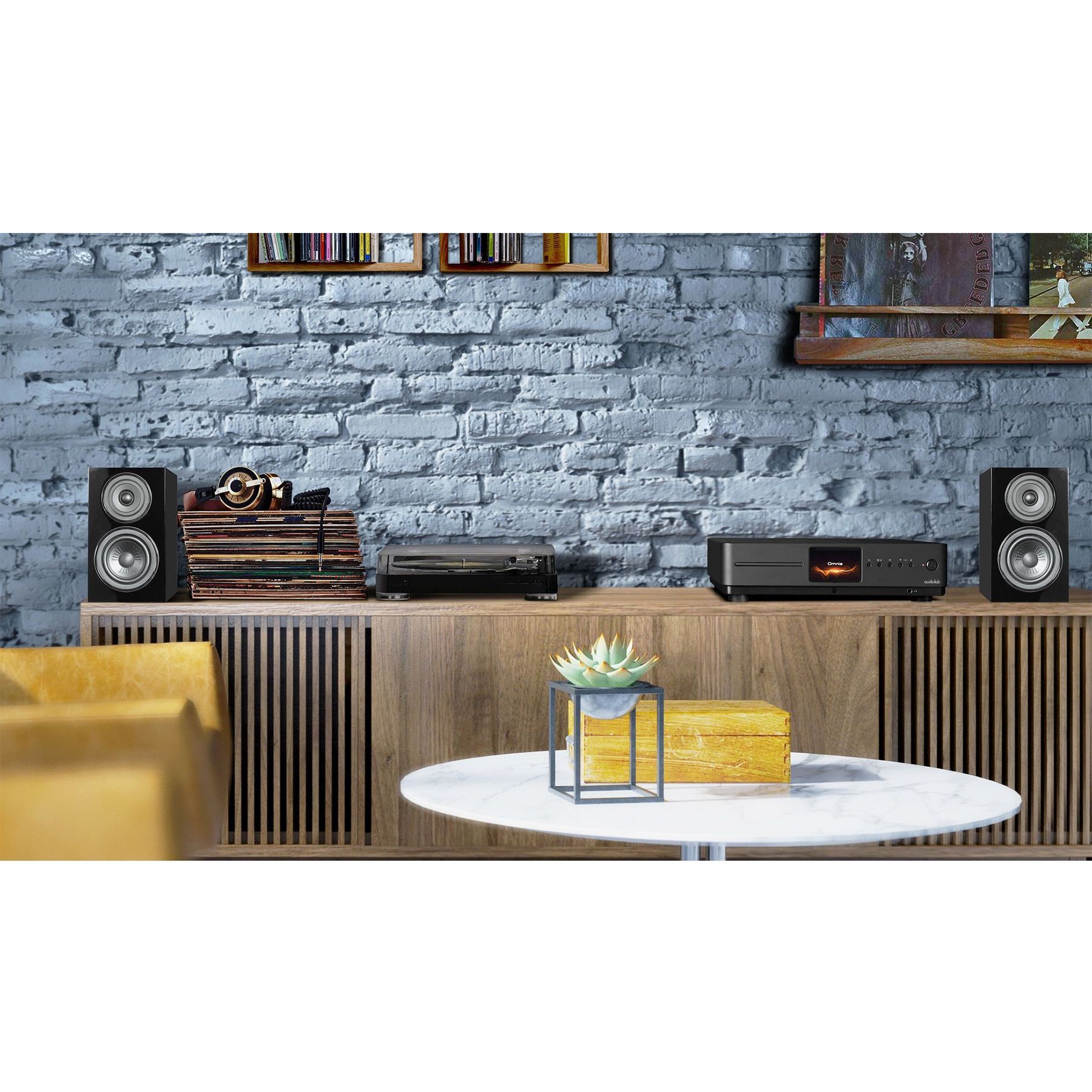 - Проигрыватель компакт-дисков, встроенный усилитель, беспроводной потоковый проигрыватель, ЦАП, усилитель для наушников и предусилитель в одном корпусе