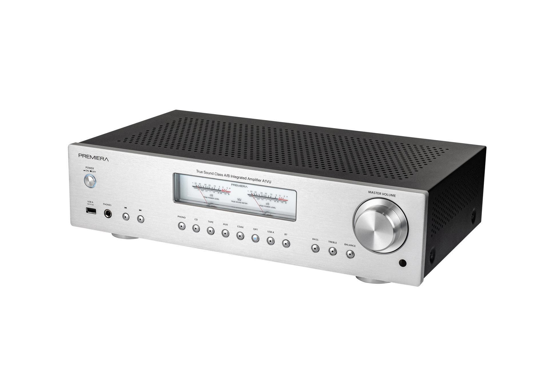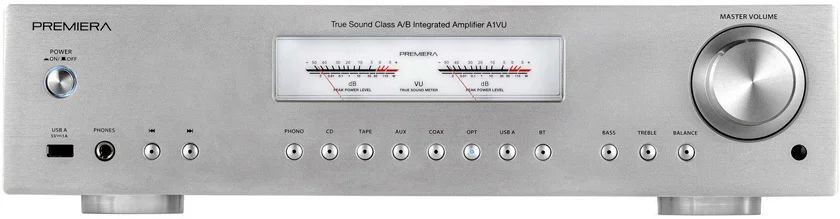 Premiera A1VU – интегральный Hi-Fi стереоусилитель класса AB со встроенными ММ-фонокорректором, ЦАП, USB, Bluetooth, стрелочными VU-индикаторами, с номинальной выходной мощностью 51 Вт на канал (8 Ом), с возможностью подключения восьми источников входного сигнала и тремя аналоговыми выходами – два стерео (для записи и для наушников) и один моно (для активного сабвуфера).