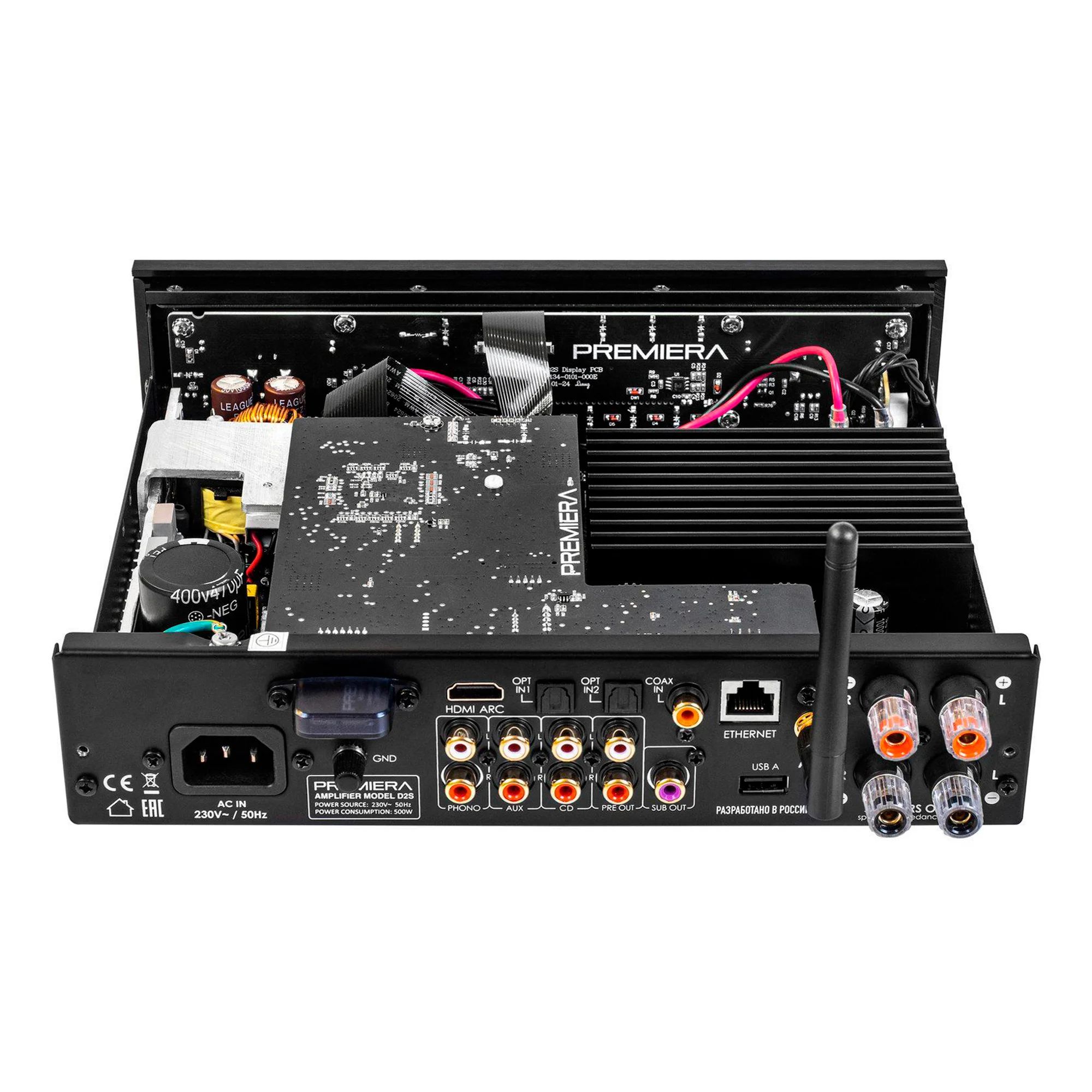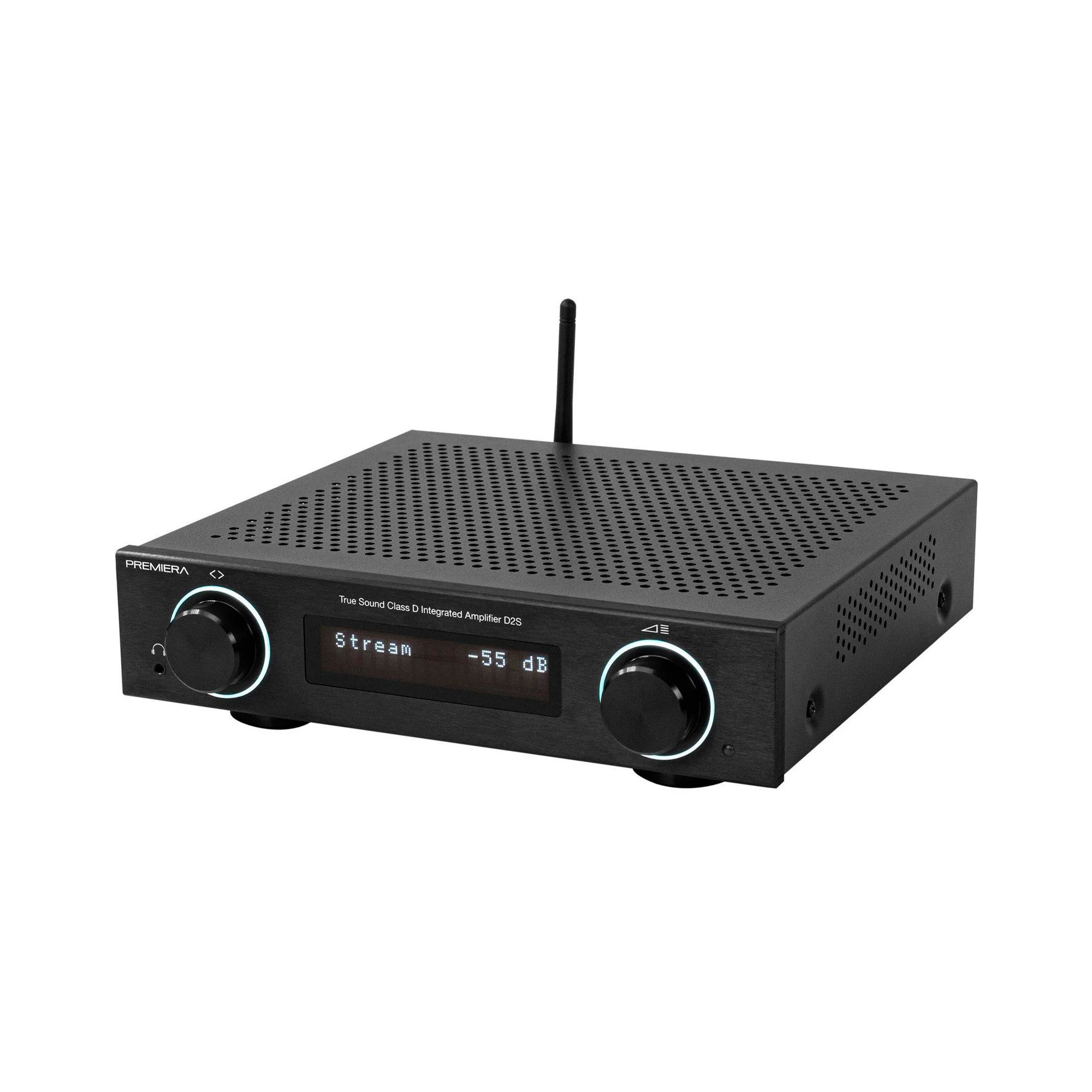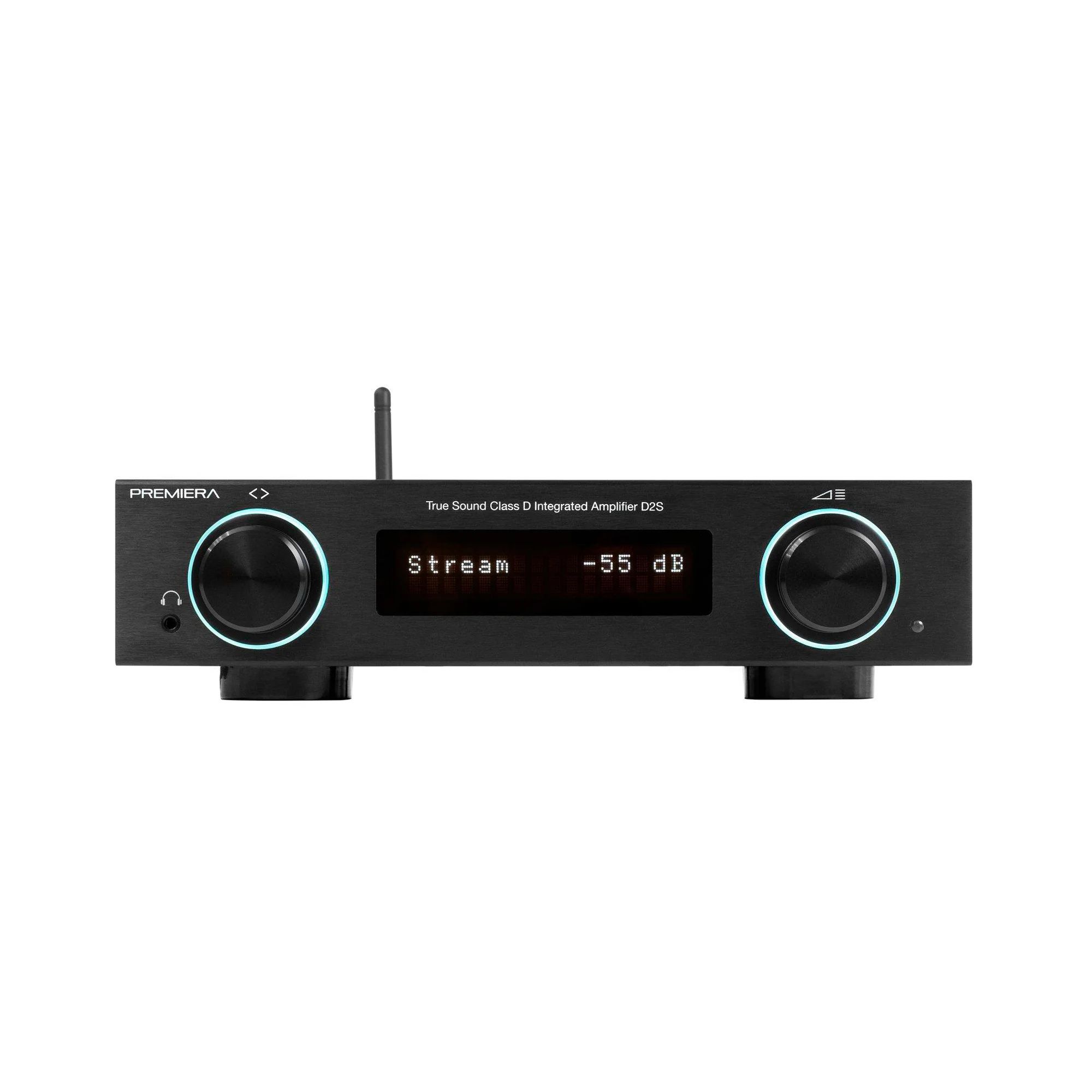 Premiera D2S — интегральный Hi-Fi стереоусилитель класса D со встроенными сетевым проигрывателем, ММ-фонокорректором, ЦАП ES9018K2M Sabre, Bluetooth aptX HD, HDMI ARC, USB, Wi-Fi, AirPlay 2, с номинальной выходной мощностью 167 Вт на канал (4 Ом) при искажениях менее 0,08%. Усилитель позволяет подключить десять источников входного сигнала, три из которых аналоговые. Также имеются три аналоговых выхода (регулируемый для внешнего усилителя и для наушников) и один моно (для активного сабвуфера).