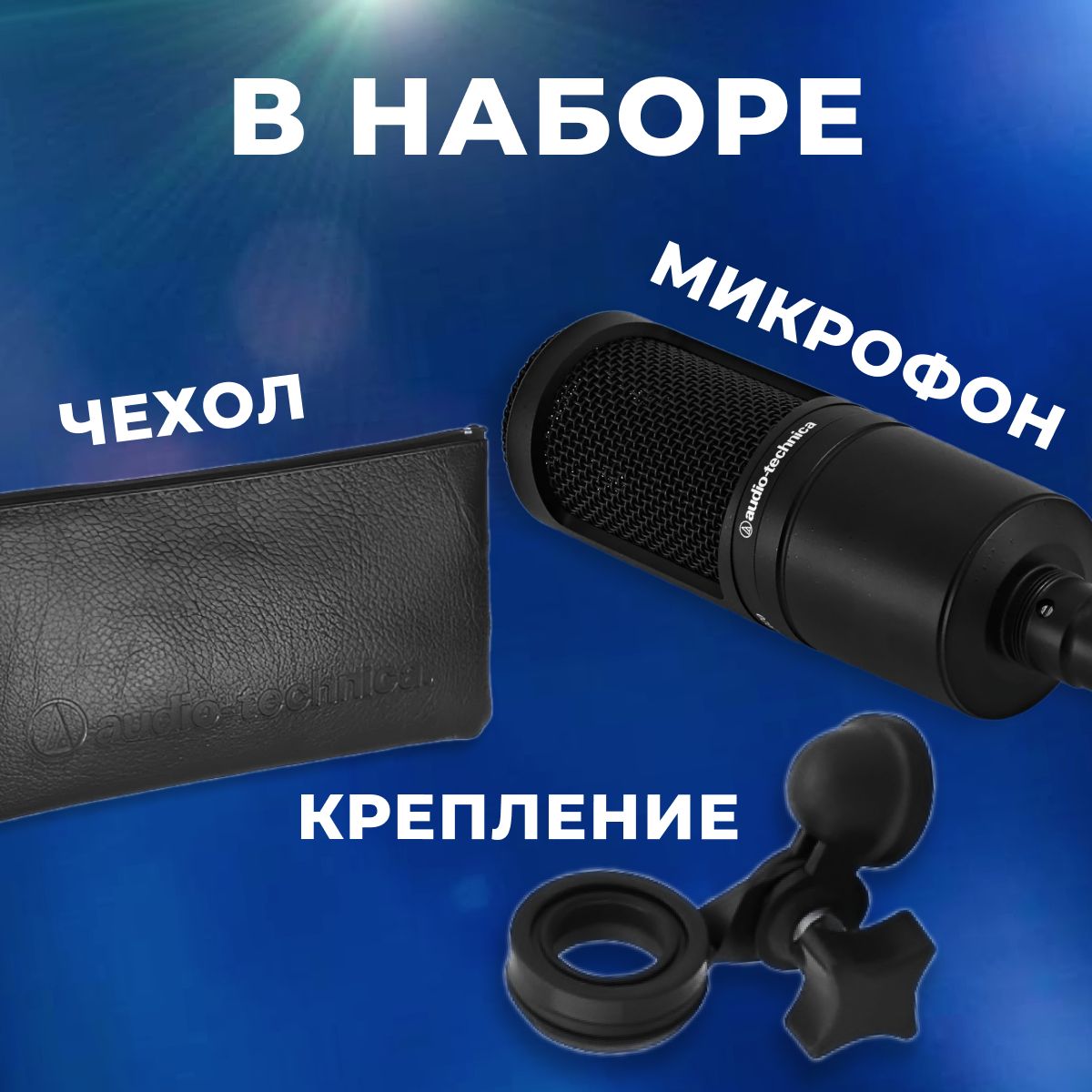 Микрофон AT2020 от ведущего производителя Audio-Technica обеспечивает великолепное студийное качество записи. Конденсаторный микрофон имеет лучшее соотношение цены и качества. Кардиоидная направленность позволяет выделить главный сигнал, отсекая посторонние шумы. Особая легкая мембрана с высокой подвижностью гарантирует замечательную динамичность и расширенный диапазон частот. Микрофон обеспечивает большие значения звукового давления при незначительном шуме. Audio-Technica AT2020 станет удачным выбором для проджект либо домашней звукозаписывающей студии. Резьбовой держатель обеспечивает надежное крепление к стойке.