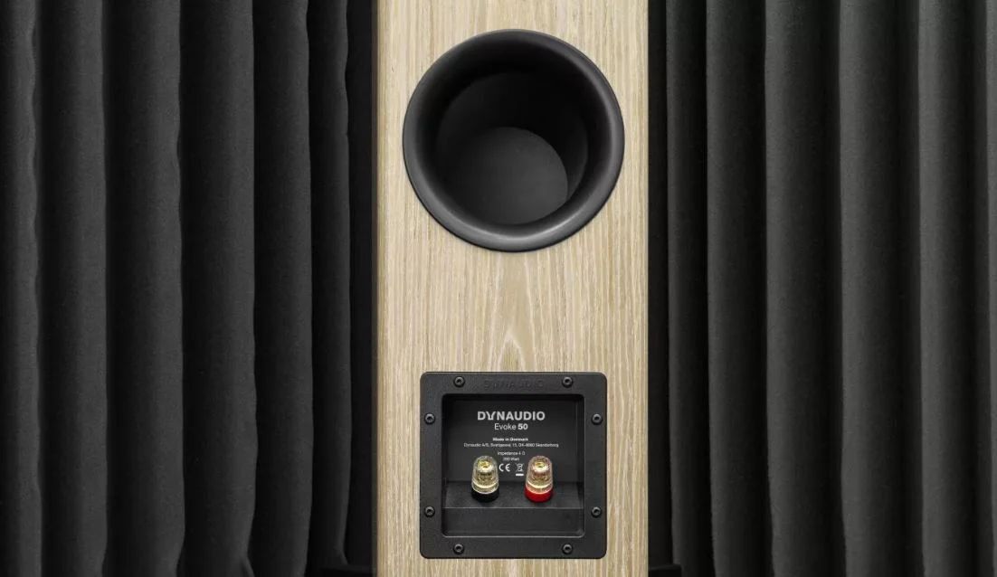 Дизайн Dynaudio Evoke 50 разрабатывала команда под руководством молодой специалистки Луизы Дальгор: использовались скетчи на бумаге, 3D-моделирование, образцы из глины и прототип с MDF-корпусом. В итоге удалось создать спикер с плавными гранями и идеальными пропорциями, который не производит впечатления громоздкости. Порт фазоинвертора вынесен в тыл колонки, причем в комплект входит заглушка из пеноматериала, позволяющая избавиться от гула в определенных типах помещений. Модель имеет две винтовые клеммы и выступающие за пределы корпуса ножки, к которым крепятся шипы.