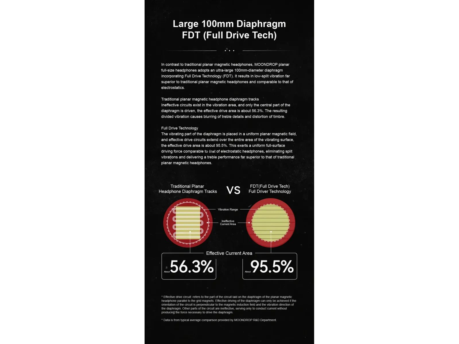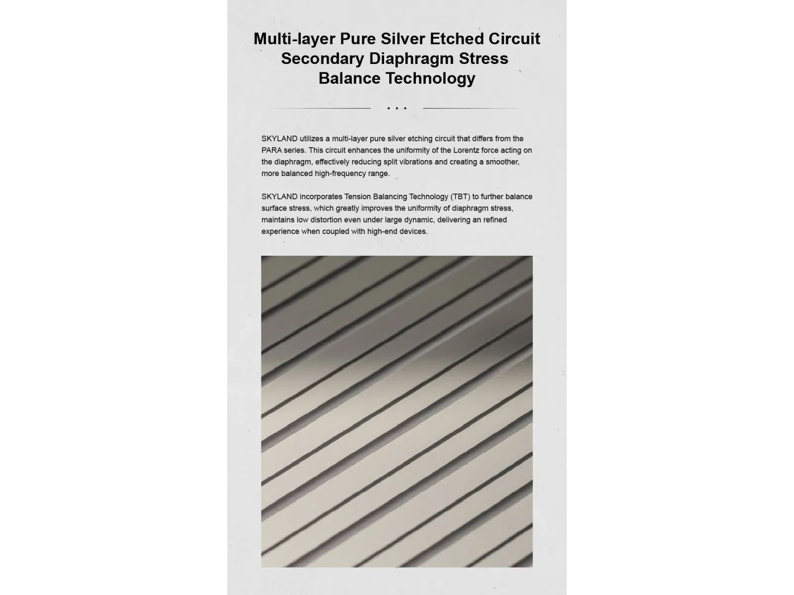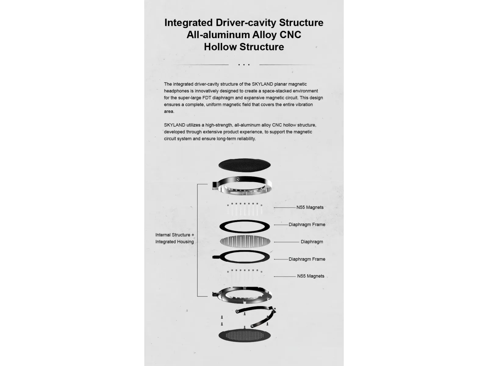 В основе — 100-мм ультратонкая диафрагма толщиной около 500 нм с технологией Full Drive Technology (FDT): приводная цепь покрывает 95,5% поверхности, обеспечивая равномерное распределение силы Лоренца, низкий уровень разделённых вибраций и гладкий высокочастотный диапазон. Массив из 36 мощных неодимовых магнитов N55 создаёт однородное магнитное поле, а многослойная цепь из чистого серебра дополнительно снижает искажения.