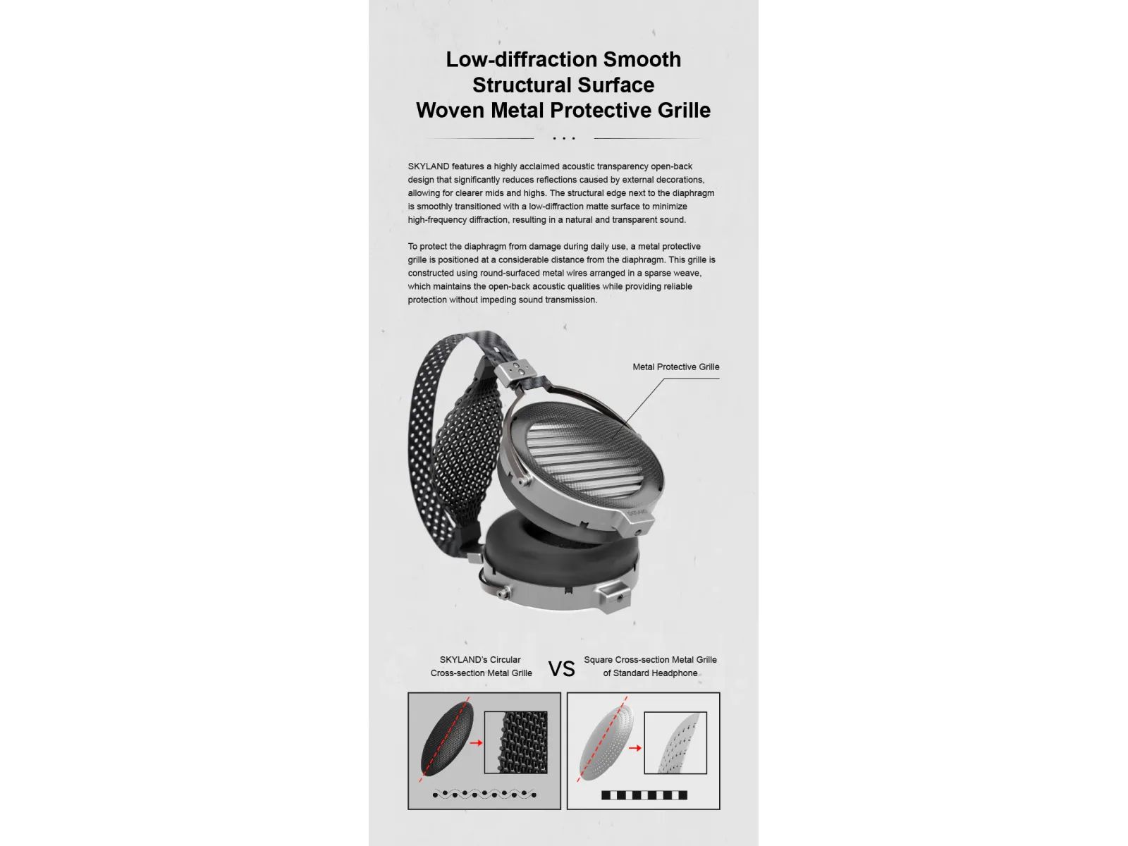 Открытая акустическая конструкция с низкодифракционной решёткой минимизирует отражения, обеспечивая широкую звуковую сцену, точное позиционирование образов, естественную середину и прозрачные верха. Звучание: нейтральное с лёгким акцентом на детализацию, богатые гармоники, быстрая атака и отличная динамика — идеально для сложных жанров, классики и высококачественных записей.