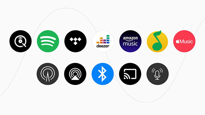 Вы можете использовать собственные приложения для потоковой передачи напрямую из Spotify Connect, Tidal и QPlay. При использовании AirPlay 2 или Chromecast вы можете транслировать музыку на несколько динамиков, чтобы воспроизводить музыку по всему дому.