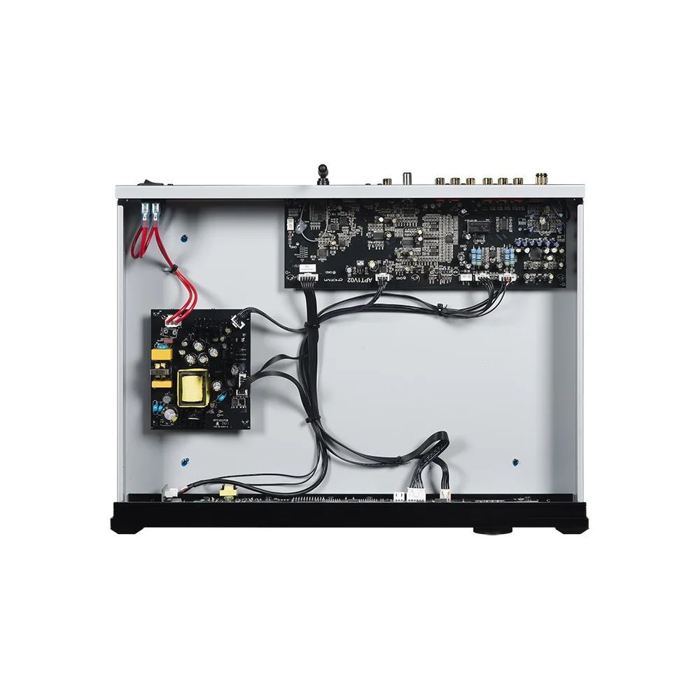 Управлять PT1 можно с помощью простых органов контроля на передней панели или ИК пульта ДУ, входящего в комплект поставки. Интуитивно понятная система меню делает модель PT1 простой в настройке и эксплуатации, а большой и четкий ярко-синий VFD-дисплей на передней панели показывает текущее состояние системы. Вместе с усилителем мощности и парой хороших колонок PT1 образует великолепно звучащую стереосистему, а встроенный активный кроссовер позволяет добавить активный сабвуфер для превращения ее в трифоник — аудиофильскую 2.1-канальную систему.