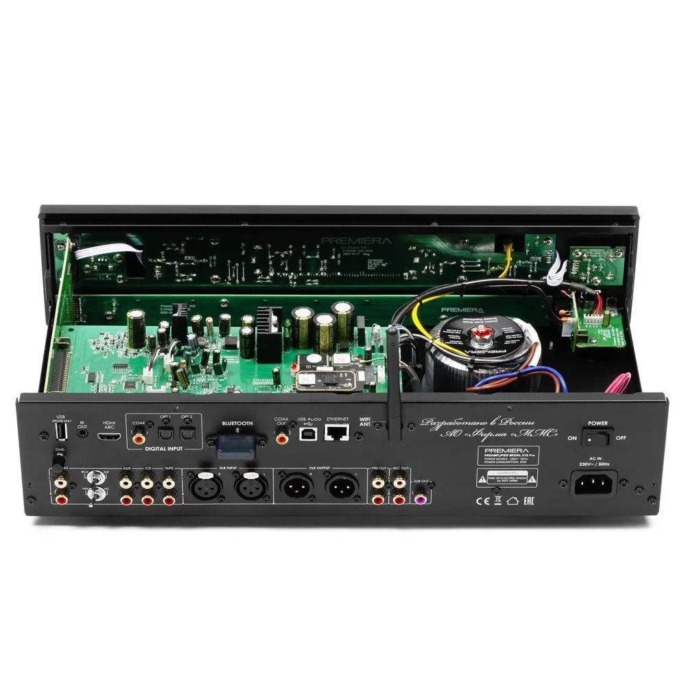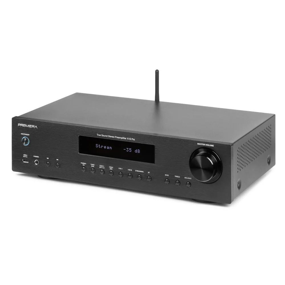Premiera X1S PRO - разработанный в России высококачественный предварительный Hi-Fi стереоусилитель со встроенными сетевым проигрывателем, ММ/МС-фонокорректором, ЦАП, Bluetooth aptX, HDMI ARC, Wi-Fi и AirPlay 2 предназначен для использования в профессиональных и домашних стереосистемах.