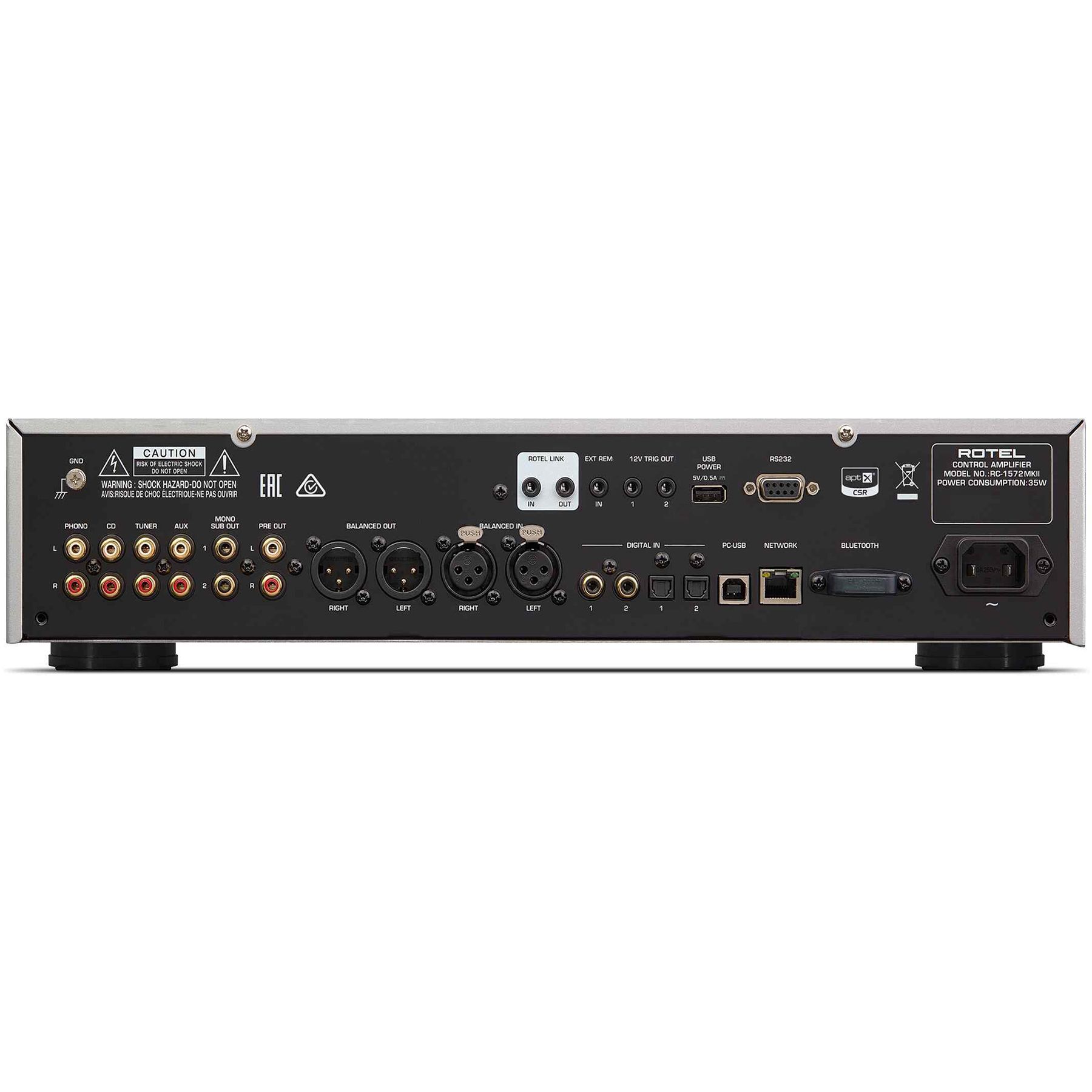 В числе аналоговых входов - балансные разъемы XLR, идеально подходящие для подключения плеера к RC-1572 MKII через его выходы XLR, а также четыре пары обычных RCA входов. Завершает список вход фонокорректора для головок звукоснимателей типа ММ. В числе выходов - балансные на XLR и небалансные на RCA вместе с моно выходом на сабвуфер. Два 12-вольтовых триггерных выхода предназначены для контроля включения/выключения усилителей и/или других компонентов. Для заказных инсталляций функции управления включают в себя RS232 со стандартным разъемом DB9, а также Ethernet-порт для IP-контроля и обновления программного обеспечения по сети.