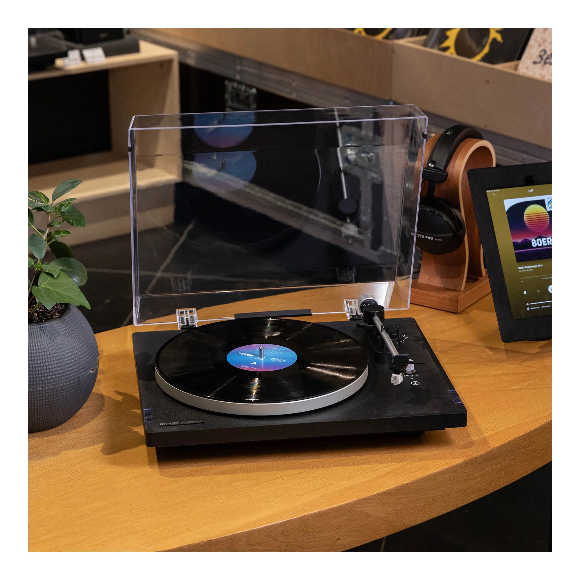 Premiera ECO BT - современный Hi-Fi стереопроигрыватель виниловых дисков со встроенным MM-фонокорректором, Bluetooth и с двумя скоростями вращения (33 и 45 оборотов в минуту).