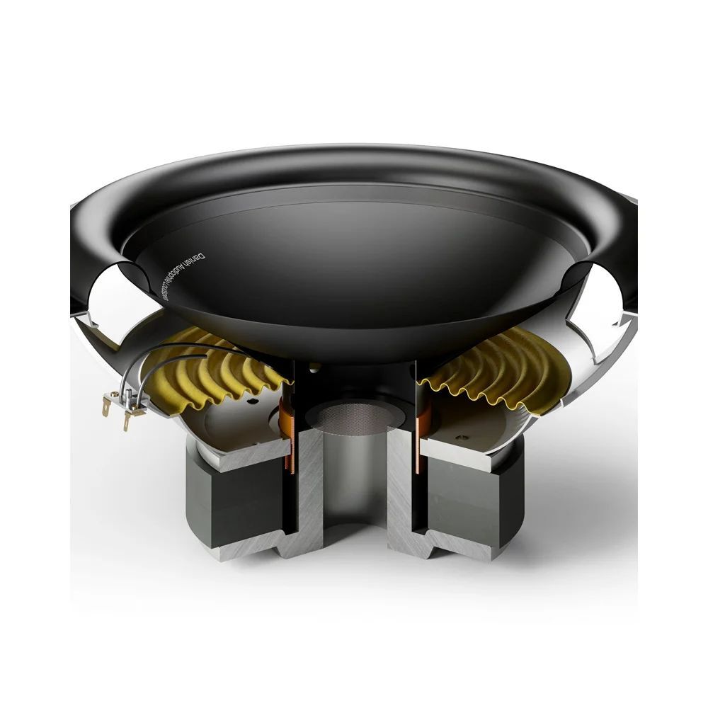 Жёсткая конструкция диффузора из алюминия или композитного материала устраняет необходимость в пылезащитном колпачке и помогает обеспечить поршневой характер движения.