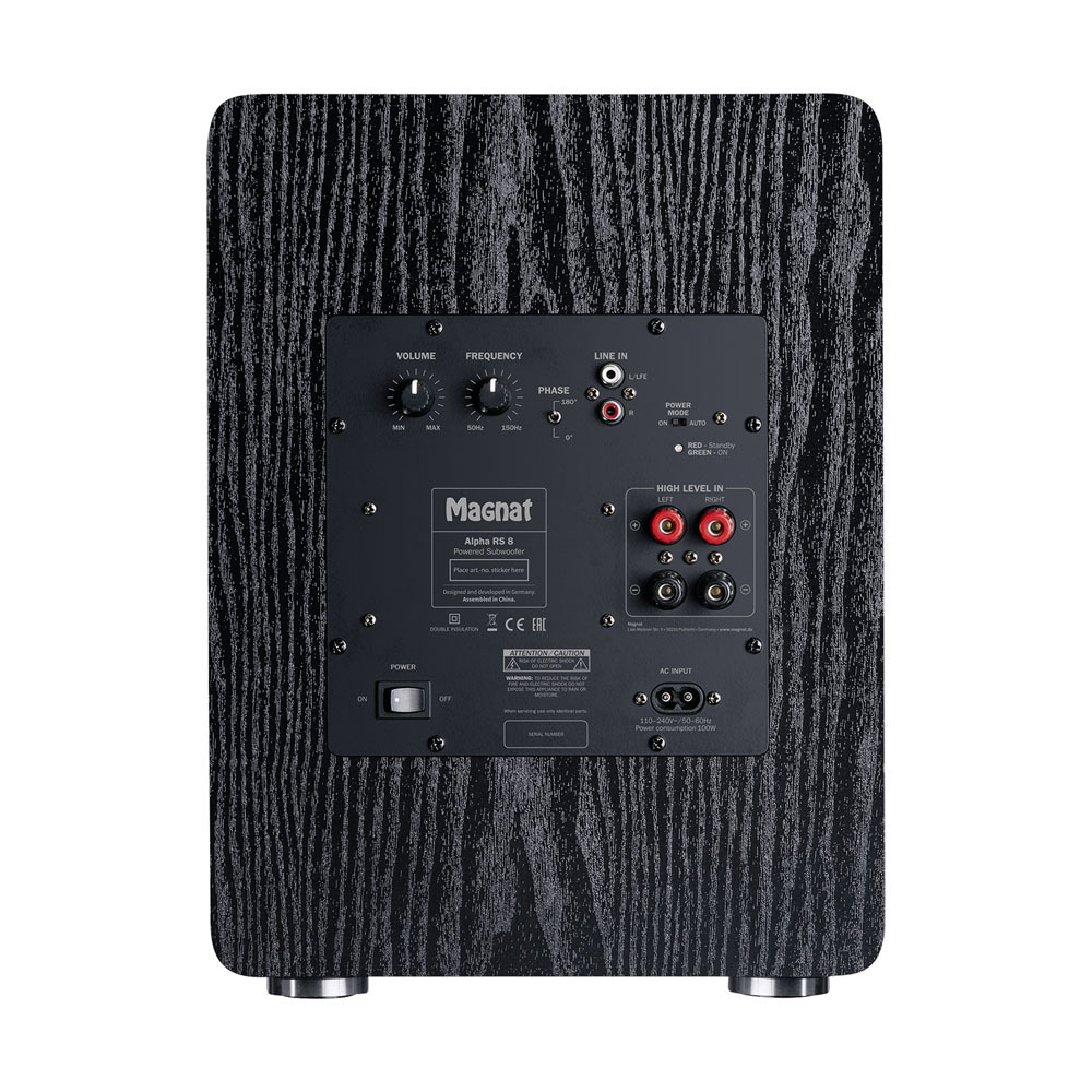 Модель Magnat Alpha RS 8 в корпусе с фазоинвертором и двумя портами Airflex оснащена 200-мм динамиком с длинным ходом диффузора. Встроенный усилитель класса D выдает 80 Вт постоянной мощности с кратковременными пиковыми всплесками до 160 Вт. Сабвуфер RS8 обеспечивает глубокий бас до 25 Гц. Встроенный усилитель позволяет регулировать громкость, частоту разделительного фильтра и фазу для оптимальной адаптации к системе с учетом акустических особенностей помещения.