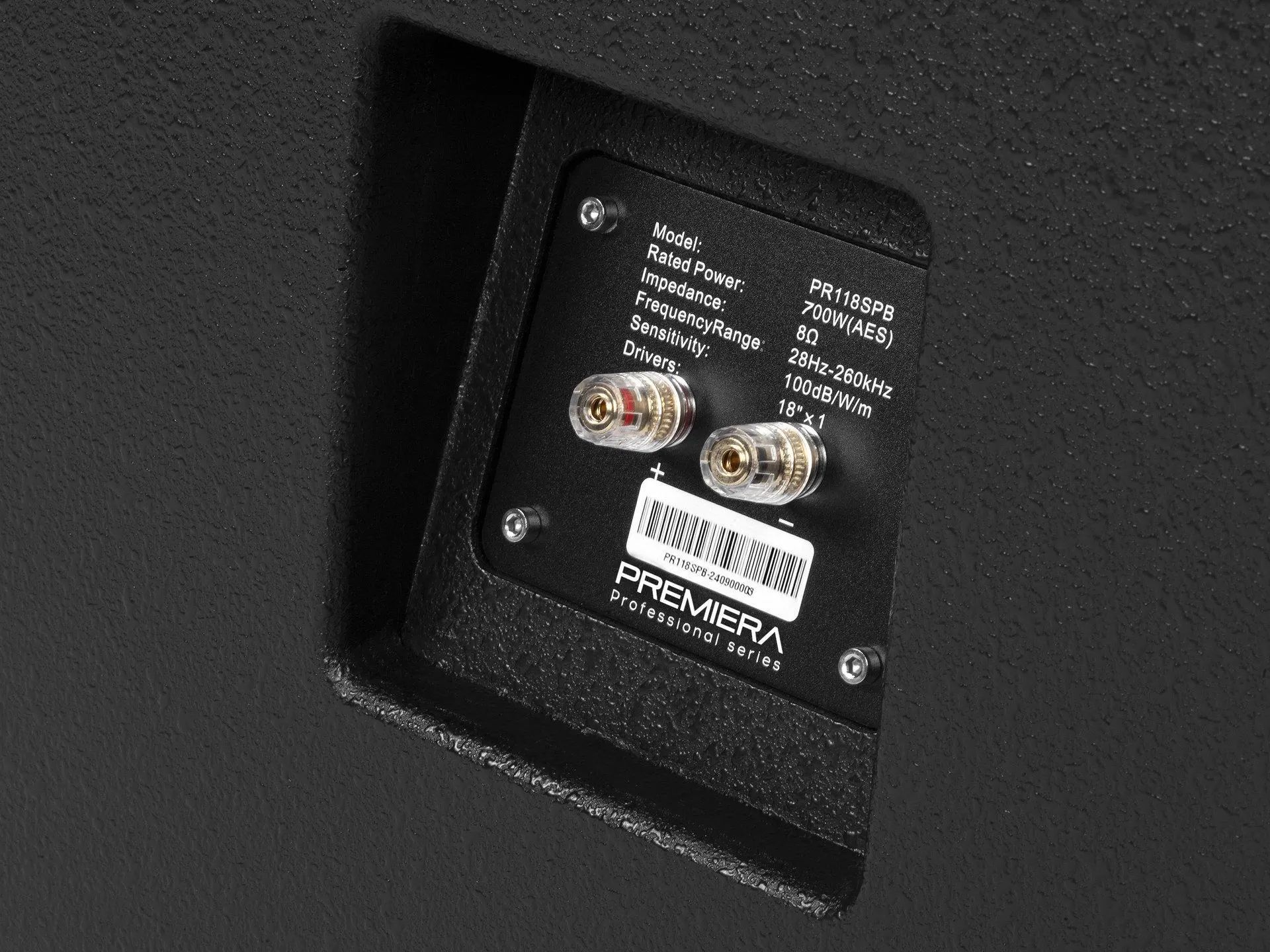 Корпус сабвуфера PR118SPB имеет фазоинверторную конструкцию. В сочетании с фазоинвертором, 18-дюймовый низкочастотный динамик обеспечивает воспроизведение в диапазоне частот от 28 Гц до 260 Гц при рекомендованной мощности усилителя до 800 Вт (8 Ом). Пассивный сабвуфер предлагается в черном варианте отделки и комплектуется тканевой защитной решеткой.
