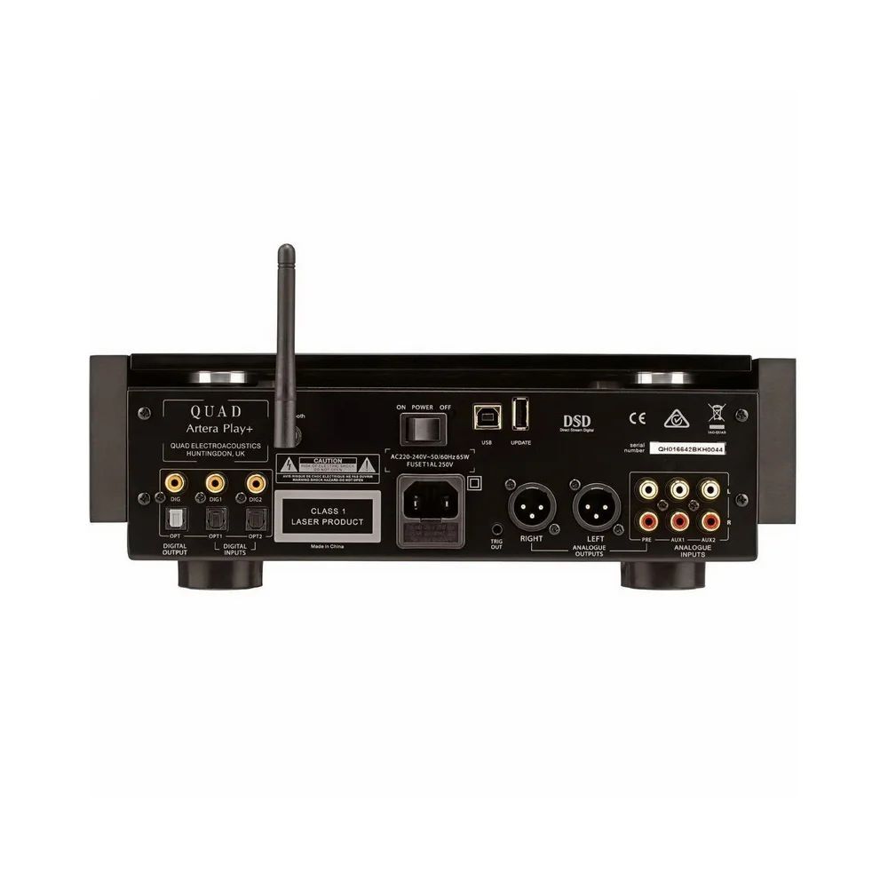 Многофункциональный девайс Artera Play от Quad вышел в новом поколении и обзавелся плюсом в названии. Обновленный плеер/ЦАП/предусилитель Quad Artera Play+ получил поддержку Bluetooth-кодека aptX, что позволит его использовать со смартфонами и другими беспроводными источниками. Выход для наушников для удобства перенесен на фронтальную панель (точнее — под фронтальную панель). Разработчики в плюсовой версии изменили питание, поставив тороидальный трансформатор покрупнее и разделив шины питания для различных цепей. Громкость регулируется цифровым образом в аналоговой схеме. Из разъемов доступны выходы RCA, XLR, оптический и коаксиальный, из входов — пара оптических, коаксиальных и USB, а также RCA. Есть и триггерный разъем.