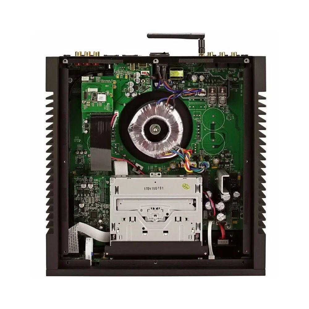 В проигрывателе Quad Artera Play+ Диски считывает щелевой привод, который сначала загружает данные в буфер и только потом отправляет их в ЦАП. Для подстройки звучания доступны четыре варианта цифровых фильтров. Судя по компоновке задней панели, внутри аппарат зонально разделен: в правой части (если смотреть сверху) находится цифровая начинка, слева – вся аналоговая. В источнике питания помимо тороидального трансформатора с раздельными обмотками и стабилизаторами имеется фильтр для отсечки наводимых из электросети помех. Дисплей – простейший, на матрице, не создающей наводок. Управление сводится к паре сенсорных кнопок и паре физических (подача питания и привод загрузчика).