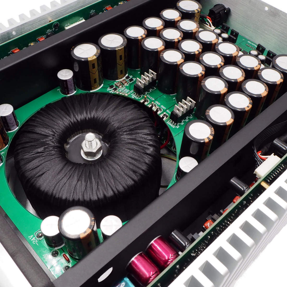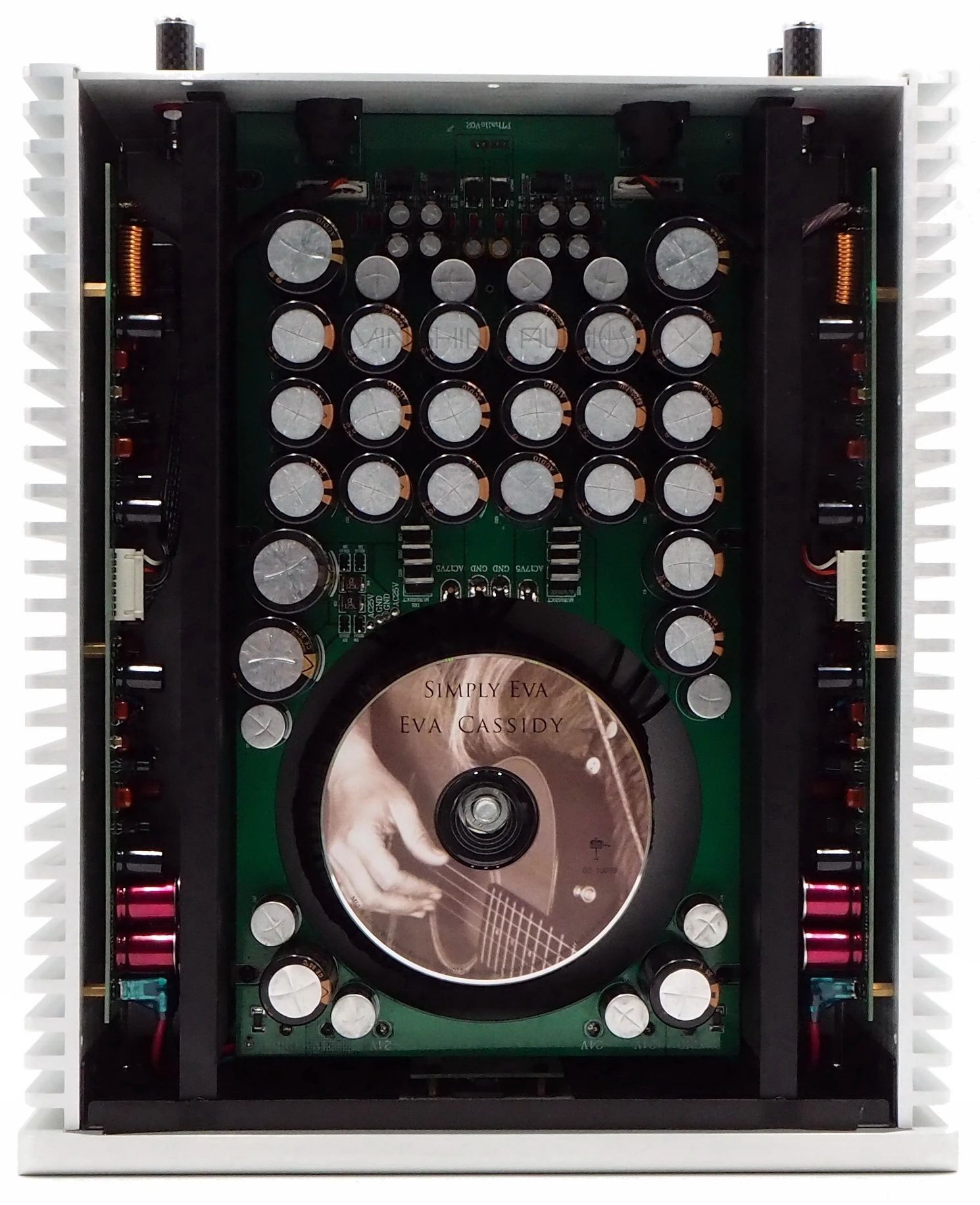 Электроника внутри THALLO великолепно скомпонована. Входная секция состоит из тороидального трансформатора, изготовленного на заказ для аудио, с медным экранированием и мощностью 600 ВА, массива из 36 штук конденсаторов большой емкости (200,400uF) и диоддов Schottky с быстрым переключением, обеспечивающим более чем достаточную мощность постоянного тока для модульных усилителей мощности. Платы силовых модулей ориентированы вертикально, по длине радиаторов боковых стенок, с четырьмя транзисторами на канал. Входные и силовые секции изолированы друг от друга внутри корпуса металлическими барьерами.