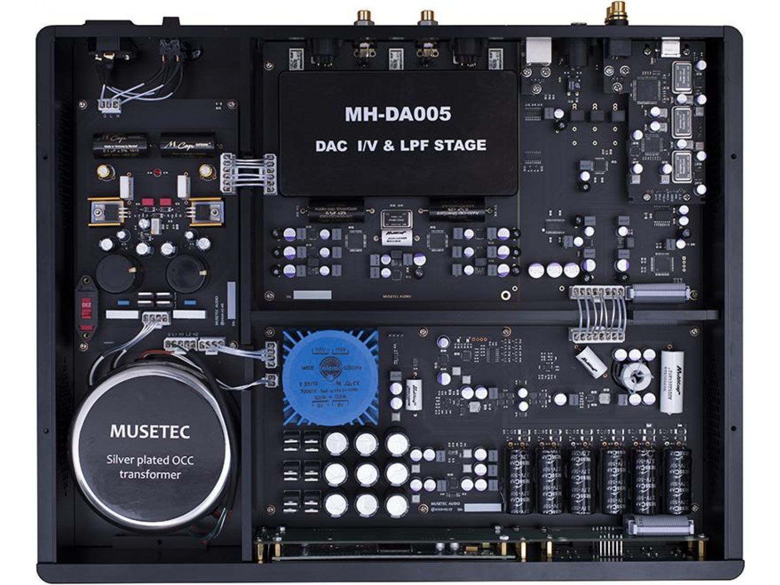 Musetec Audio MH-DA005 – это топовый ЦАП. Он построен на основе пары чипов ES9038Pro. Их потенциал помогает раскрыть красивая реализация. Cхема ЦАП использует большое количество двойных JFET и двойных транзисторов для обеспечения большей точности характеристик. К тому же балансный и небалансный выходы имеют одинаковую схему фильтра низких частот LPF. Это позволяет, в частности, добиться одинаково высокого качества звука, независимо от того, какой выход используется.