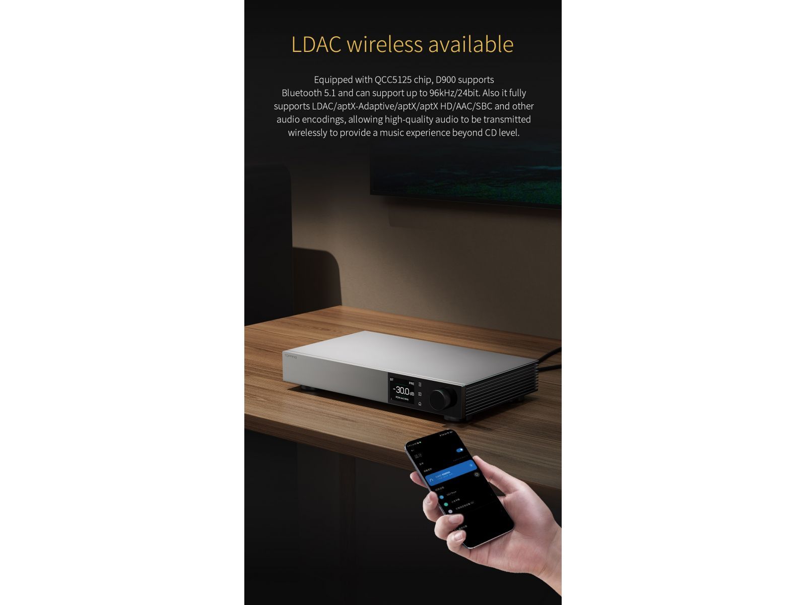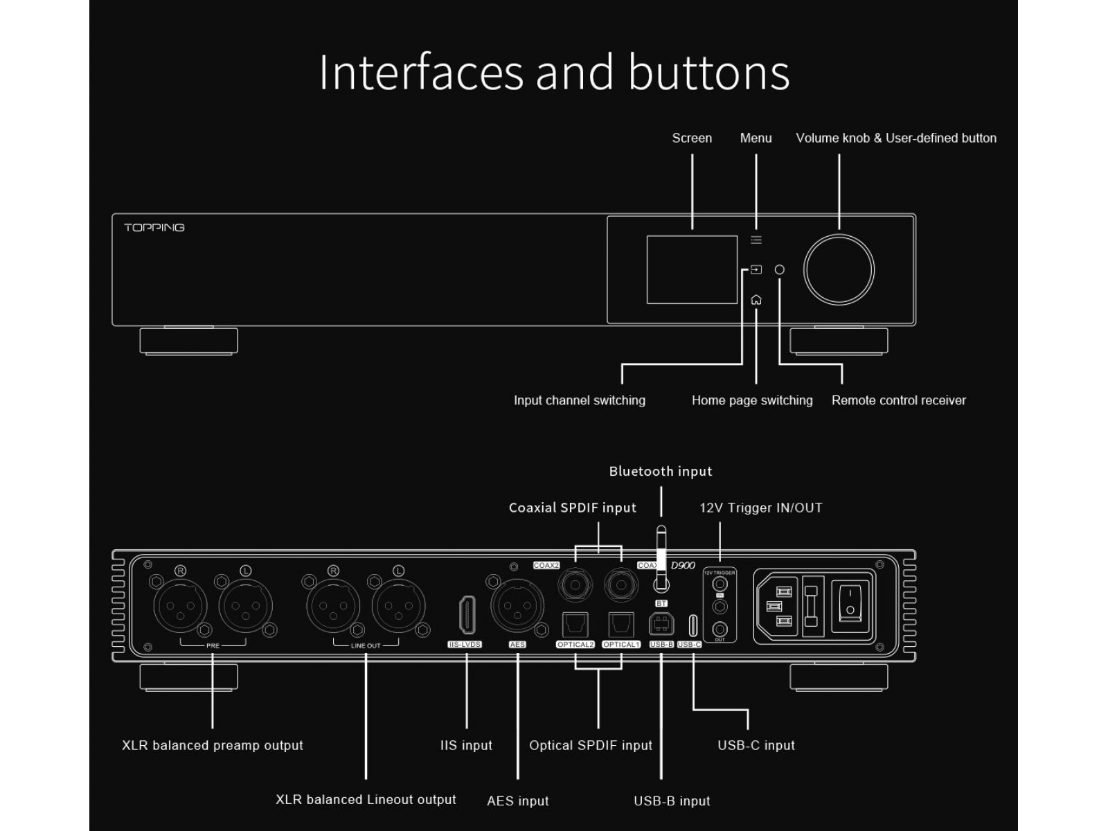 Topping D900 имеет широкий спектр цифровых входов, которые позволяют пользователям подключать D900 к широкому спектру устройств. Он оснащен портами USB Type-C, Type-B, оптическим, коаксиальным, Bluetooth V5.1, AES и IIS-LVDS. Хотите ли вы подключить свой ПК через USB, CD-плеер через оптический/коаксиальный, или любого другого устройства, Topping D900 имеет универсальный вариант портов для удобства размещения.