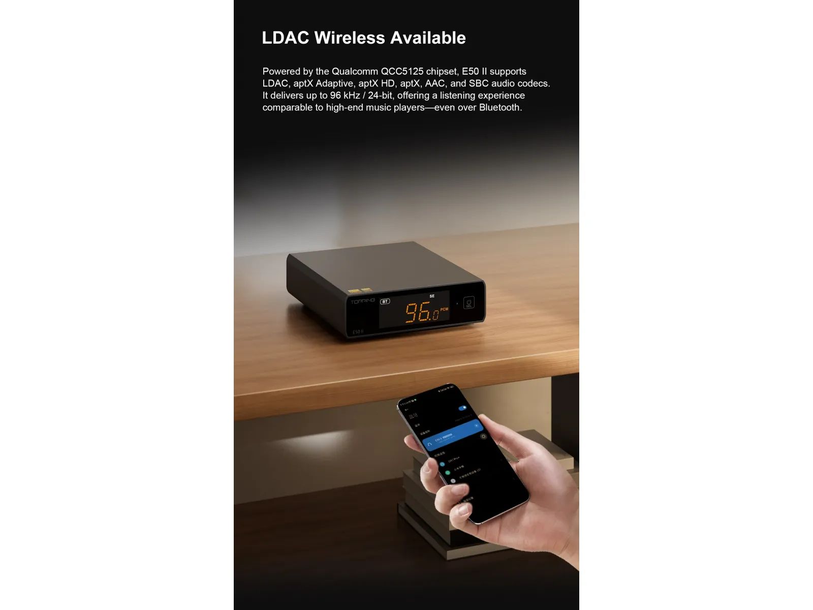 Помимо проводной коммутации, Topping E50 II предлагает Bluetooth-подключение с поддержкой кодеков SBC и AAC, а также aptX, aptX HD, aptX Adaptive и LDAC. Это обеспечивает удобную беспроводную передачу контента в высоком качестве — идеальный вариант для пользователей, ценящих гибкость и комфорт.