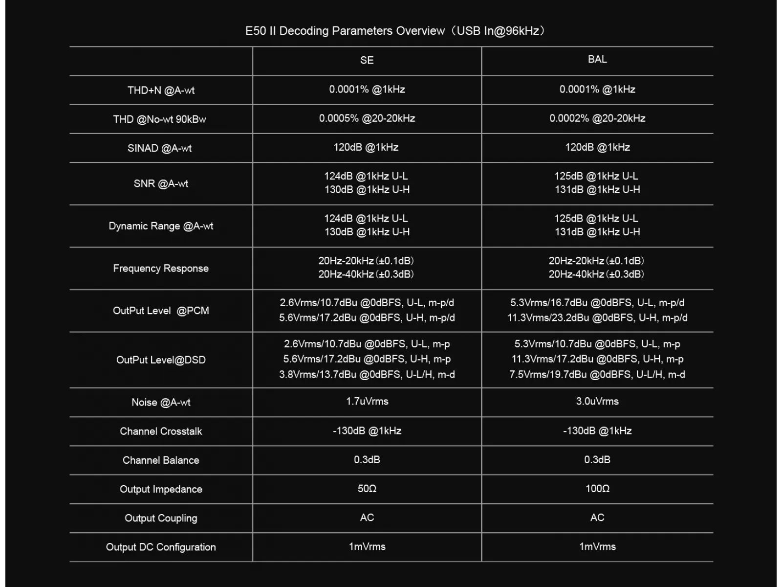 ЦАП Topping E50 II оснащён как разъёмами RCA, так и балансным стерео-выходом на разъёме джек 6,3 мм. Оба выхода могут работать параллельно, благодаря чему ЦАП подходит и для подключения к классическим Hi-Fi-усилителям, и к студийным мониторам. В зависимости от задачи выходной сигнал может быть фиксированным (режим DAC) или регулируемым (режим предусилителя).