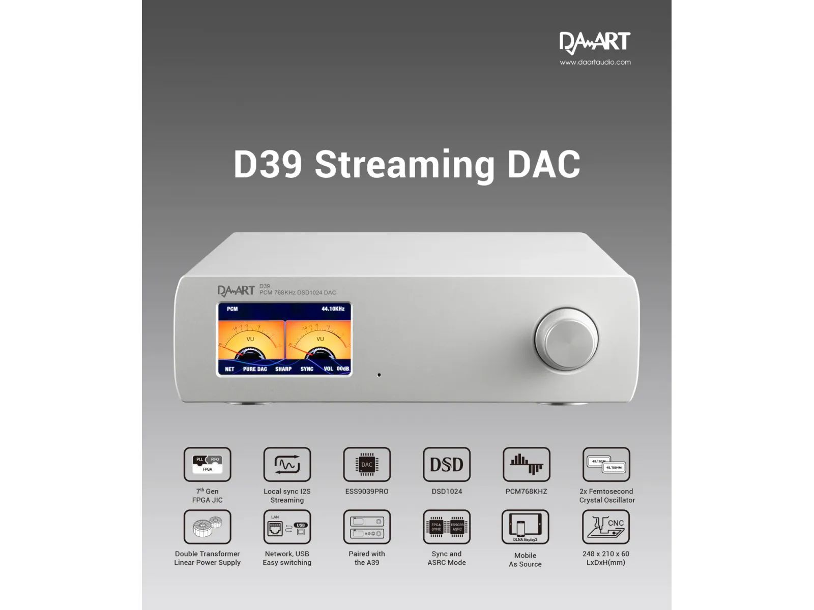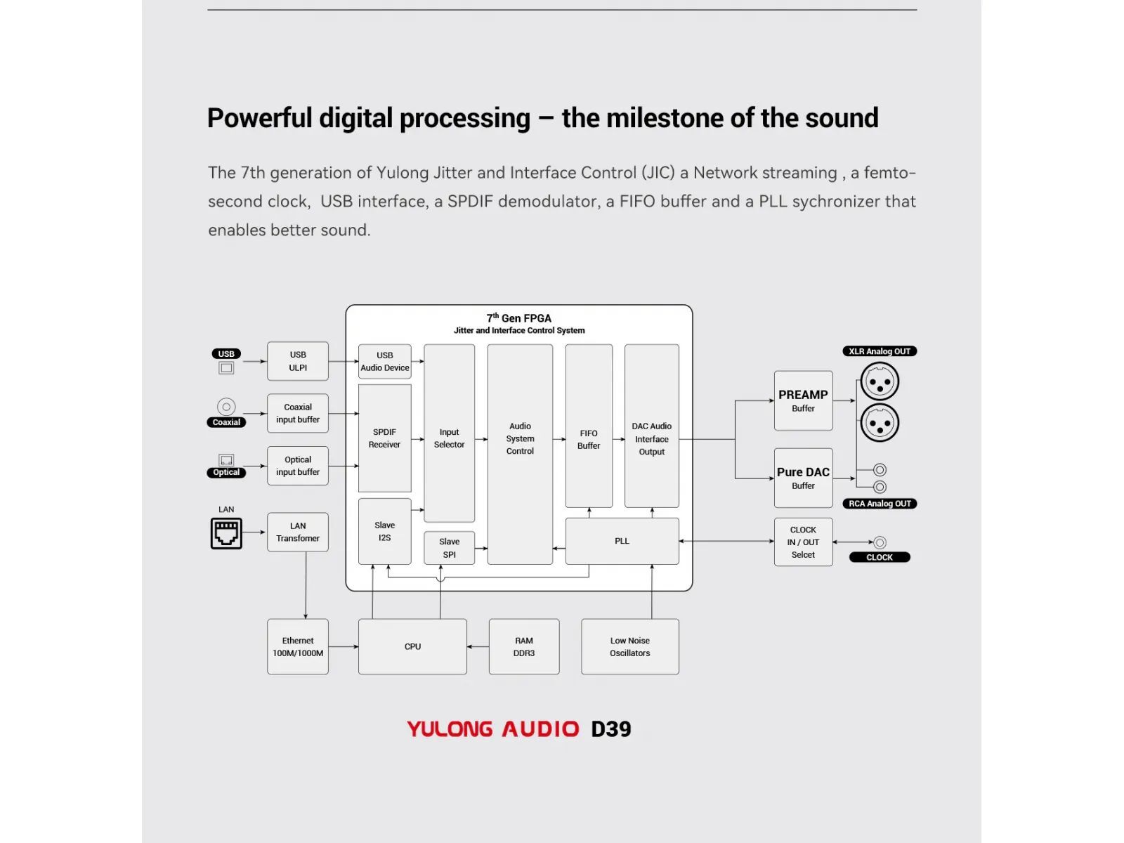 В D39 используется двухъядерный процессор с блоком питания и схемой расположения памяти, специально оптимизированной для обеспечения качества звука. Он работает под управлением оптимизированного ядра Linux с высокопроизводительным кодом собственной разработки, который напрямую взаимодействует с ПЛИС. Это позволяет интегрировать все функции, такие как декодирование потоковой передачи по сети, интерфейс USB, демодуляция SPDIF, кодирование SPDIF, преобразование данных в формат FIFO и синхронизация PLL, в CPU+FPGA. Для воспроизведения потоковой передачи по сети используется ведомый интерфейс процессора I2S (режим slave), который работает с кварцевыми генераторами с низким уровнем шума, которые служат в качестве основных тактовых импульсов для потоковой передачи аудио. Это обеспечивает более качественный режим передачи данных по сравнению с аудио USB и обычными интерфейсами I2S. Глубокая интеграция программного и аппаратного обеспечения оптимизирует передачу данных, повышая качество звука.