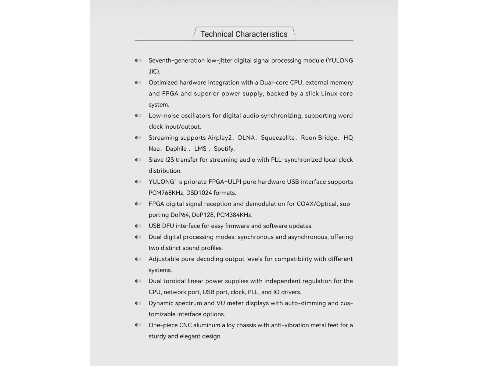 На протяжении 20 лет своего развития компания YULONG изучала секрет высококачественного звука, разрабатывая запатентованные технологии и создавая собственную технологическую экосистему. Модуль обработки цифрового сигнала на ПЛИС YULONG с низким уровнем дрожания — Процессор для управления дрожанием и интерфейсом (JIC processor) — служит ядром цифровых аудиотехнологий, постоянно совершенствующихся. Многие члены команды — опытные меломаны, и их любовь к музыке побуждает нас полностью посвятить себя процессу настройки, сочетая технологии со слуховым опытом. В результате появилась инновационная технология, которая упрощает использование продукта и позволяет наслаждаться музыкой.