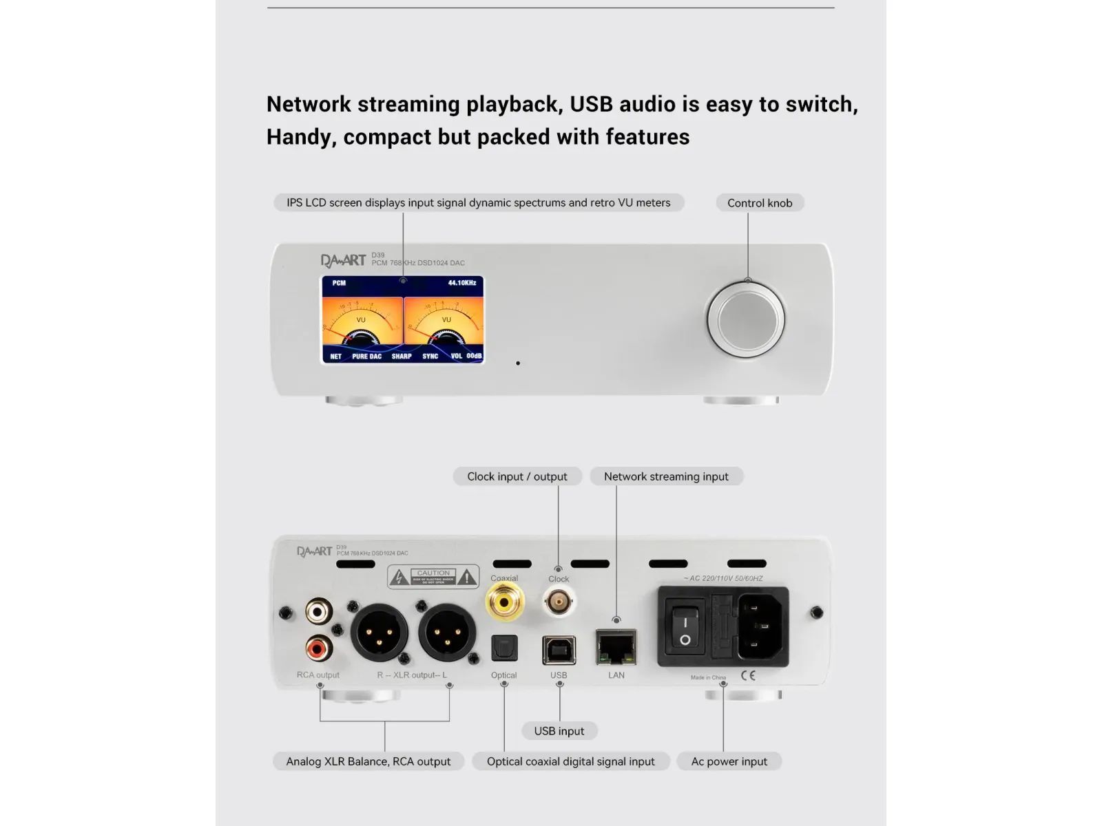 D39 — это устройство для потоковой передачи и декодирования аудио, основанное на новейшем JIC-процессоре седьмого поколения от YULONG и ЦАП ESS9039SPRO в сочетании с линейным источником питания с низким уровнем шума, предлагающим сбалансированные и несимметричные аналоговые выходы. Он поддерживает USB и сетевые входы, совместимые с форматами DSD1024/PCM768 кГц. Сетевой вход поддерживает распространенные методы потоковой передачи, такие как Airplay2, DLNA, Squeezelite, Roon Bridge, штаб-квартира Naa, Daphile, LMS, Spotify и другие функции синхронизации ввода/вывода word clock.