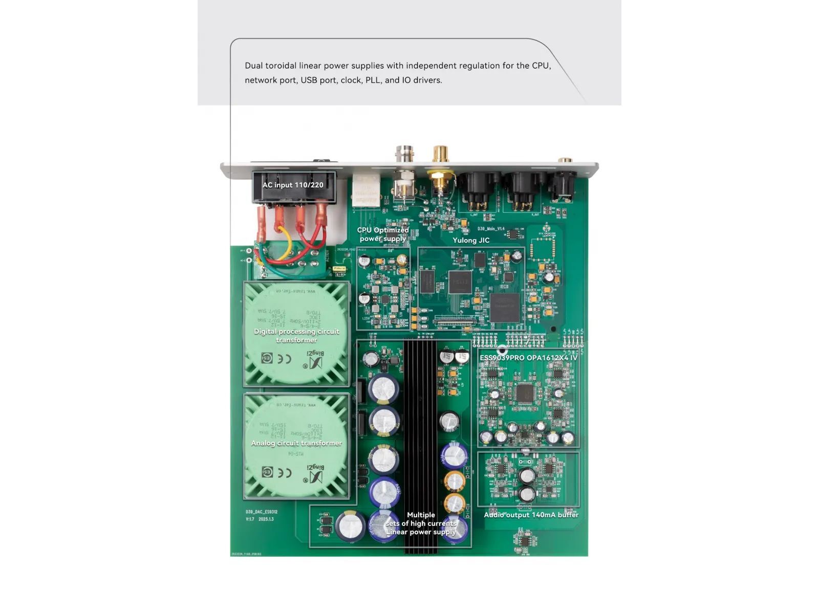 Двойные тороидальные трансформаторы питают цифровые и аналоговые схемы по отдельности. ЦАП ESS9039PRO работает от прецизионного аналогового источника питания, поддерживающего синхронный режим, позволяющий обойти встроенный ASRC ESS9039PRO для прямого декодирования собственных частот дискретизации звука. Уровень выходной мощности регулируется в два этапа, что делает его хорошо совместимым с различными системами.