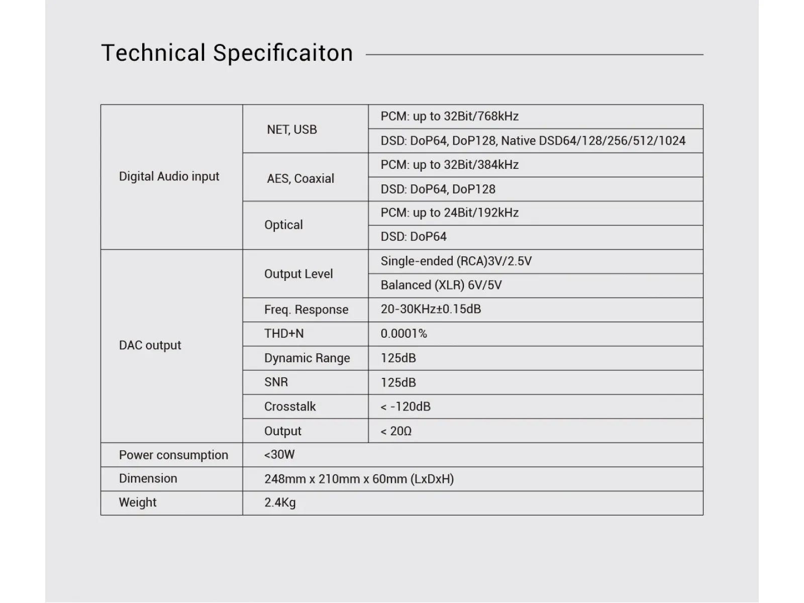 Интерфейс USB использует архитектуру FPGA+ULPI, работающую в чисто аппаратном режиме. По сравнению с традиционными интерфейсами USB (которые основаны на программно-управляемых модулях), он обеспечивает более высокую скорость работы и более быстрое время отклика. Низкошумные кварцевые преобразователи частоты действуют как основные тактовые сигналы для синхронизации цифрового аудиовыхода, сводя к минимуму ухудшение качества звука, вызванное преобразованием по протоколу передачи аудиоданных. Он поддерживает форматы PCM768 кГц и DSD1024.