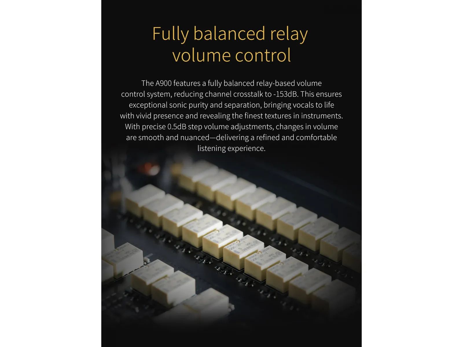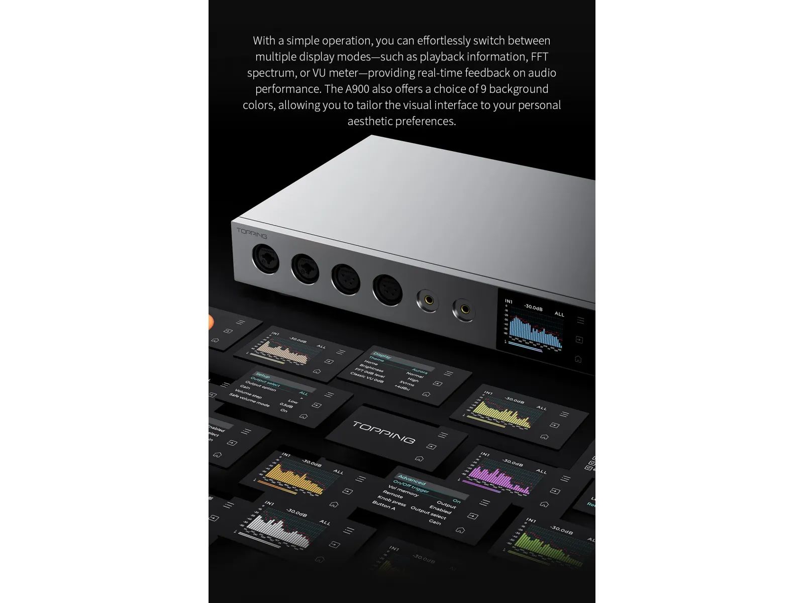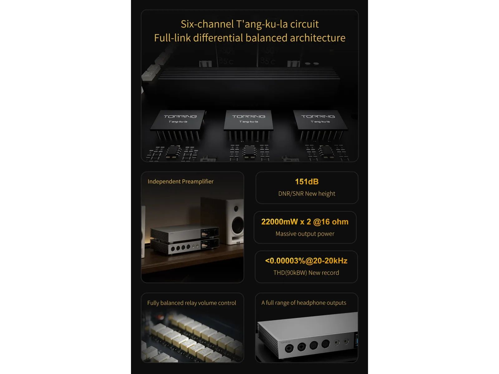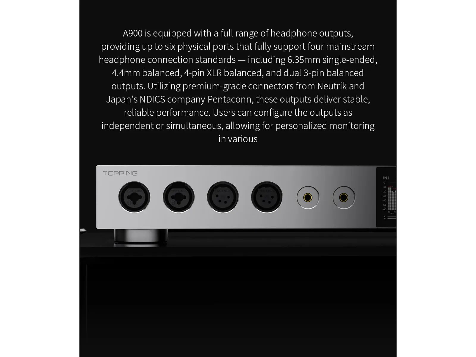 Topping A900 — это мощнейший настольный усилитель для наушников, призванный побить все предыдущие рекорды. Будь то лучшие показатели SNR, DNR, самые низкие показатели THD+N или самый мощный выход для наушников, Topping A900 здесь, чтобы заявить о себе по всем этим характеристикам. С мощным выходом 22 000 мВт на канал при нагрузке 16 Ом, Topping A900 содержит всю мощь, которая нужна любым наушникам на планете. Благодаря шестиканальной полностью дифференциальной схеме T’ang-ku-la, A900 обещает не что иное, как исключительное звуковое совершенство. Это очень прозрачный и чистый усилитель для наушников, который заставит ваши наушники петь. Topping A900 поддерживает различные выходные порты, включая 4,4 мм, 6,35 мм, 4-контактный XLR и два 3-контактных XLR. Пользователи могут настроить выходной сигнал как независимый или одновременный с нескольких выходов. Выведите качество звука в наушниках на непревзойденный уровень с совершенно новым Topping A900!