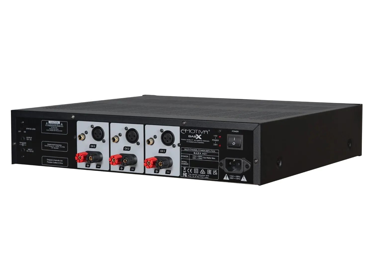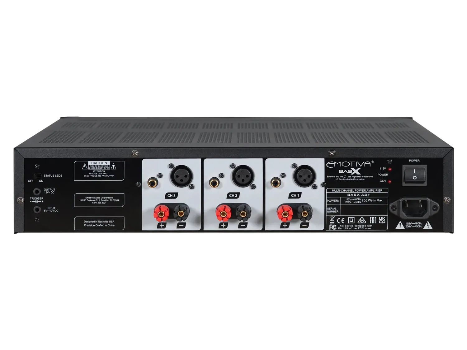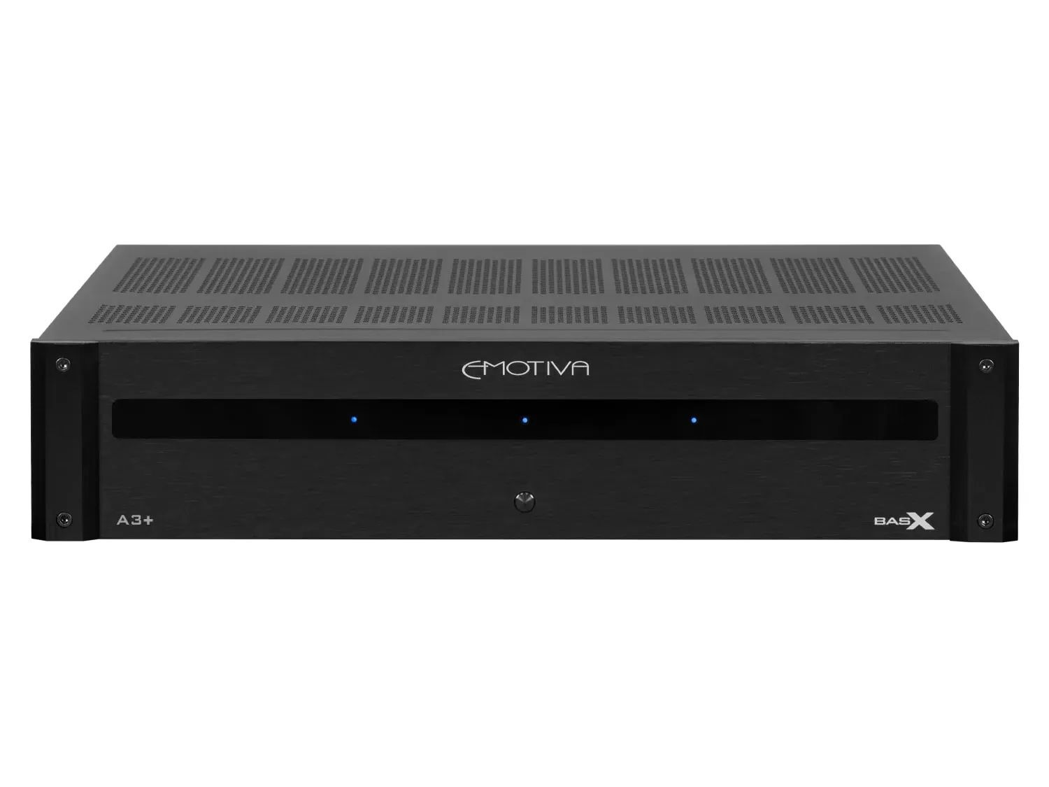 Emotiva A3+ — это трёхканальный усилитель мощности, который выдаёт 140 Вт на канал при сопротивлении 8 Ом и 200 Вт на канал при сопротивлении 4 Ом, при этом все каналы работают, а номинальный коэффициент нелинейных искажений THD+N составляет менее 0,02%, а соотношение сигнал/шум по шкале A — 112 дБ. Усилитель BasX A3+ оснащён мощным линейным источником питания, высококачественным усилителем класса A/B, прозрачной защитой от неисправностей, а также входом и выходом триггера.