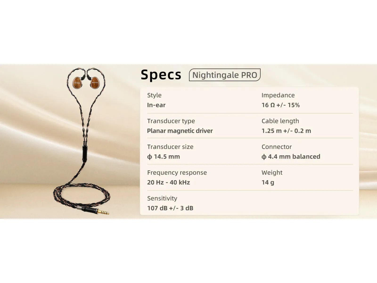 SIVGA Nightingale PRO – новые внутриканальные наушники с плоским излучателем, выполненные в корпусе из алюминиево-магниевого сплава и декоративными вставками из зебрано. Модель оснащена собственным планарным драйвером с тонкой композитной мембраной и многополосной магнитной системой. Наушники используют съёмный кабель формата 0.78 мм с заушной фиксацией и 4.4 мм балансным штекером.
